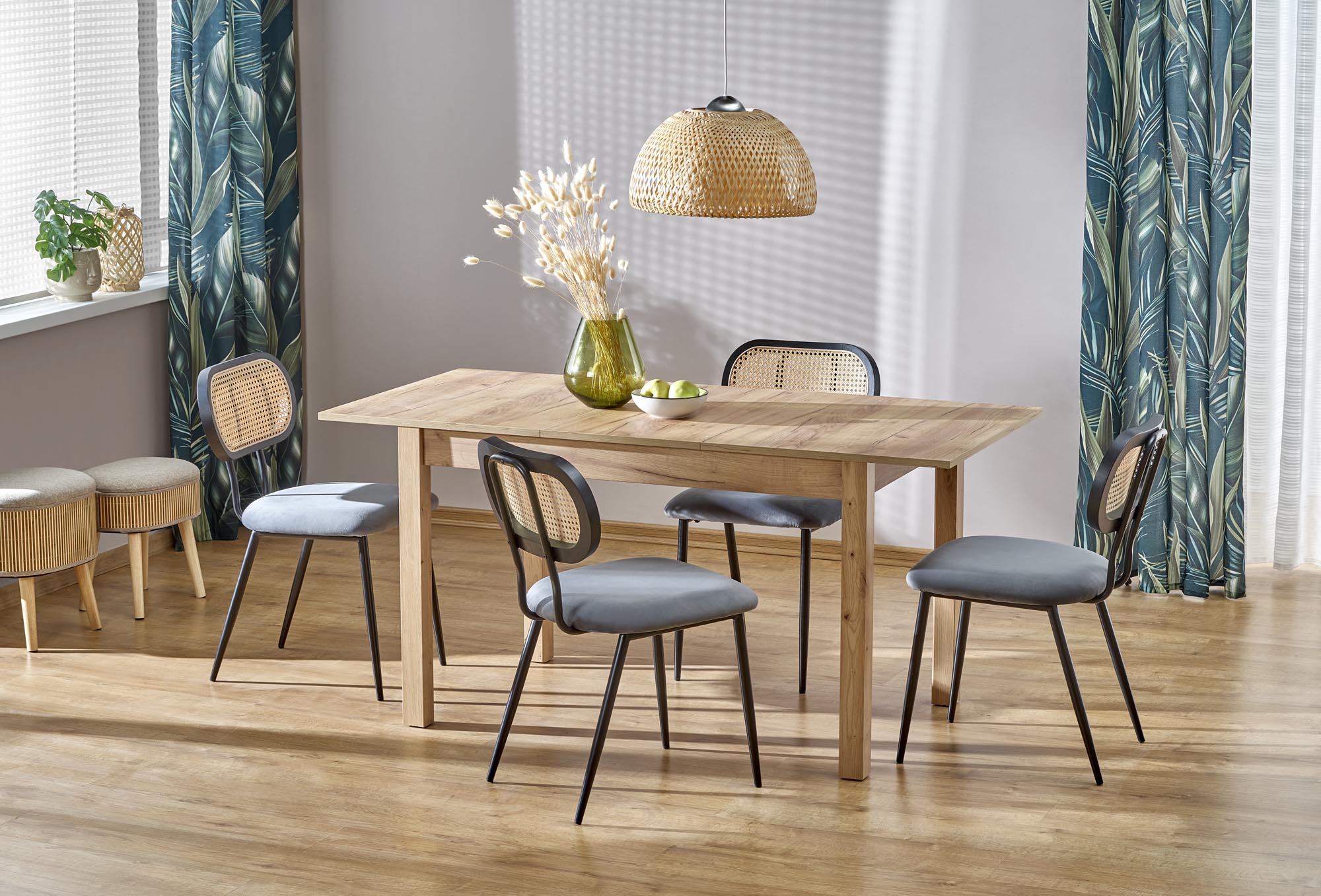 stół rozkładany, wymiary: 118÷158/75/76 cm, materiał: blat – płyta laminowana, na obrzeżach ABS, nogi – MDF laminowany, kolor: dąb craft