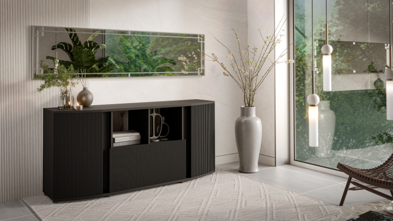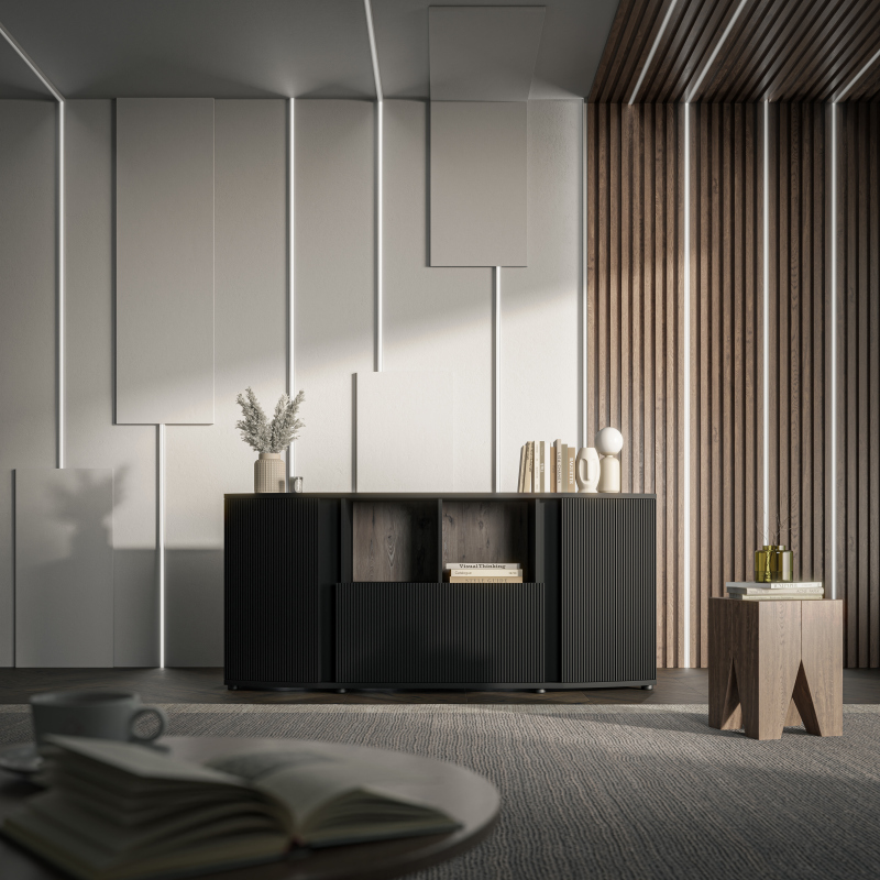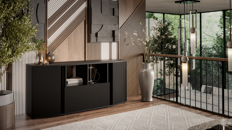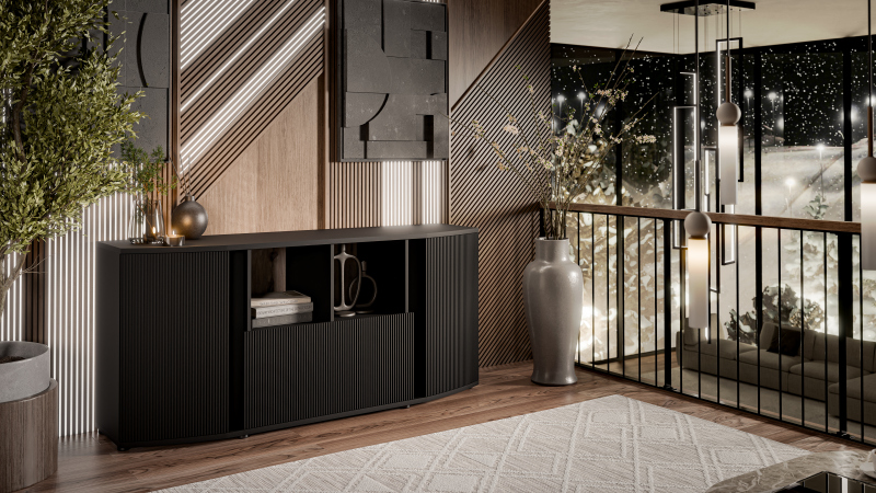 Front: płyta MDF laminowana 16mm z widocznymi frezami