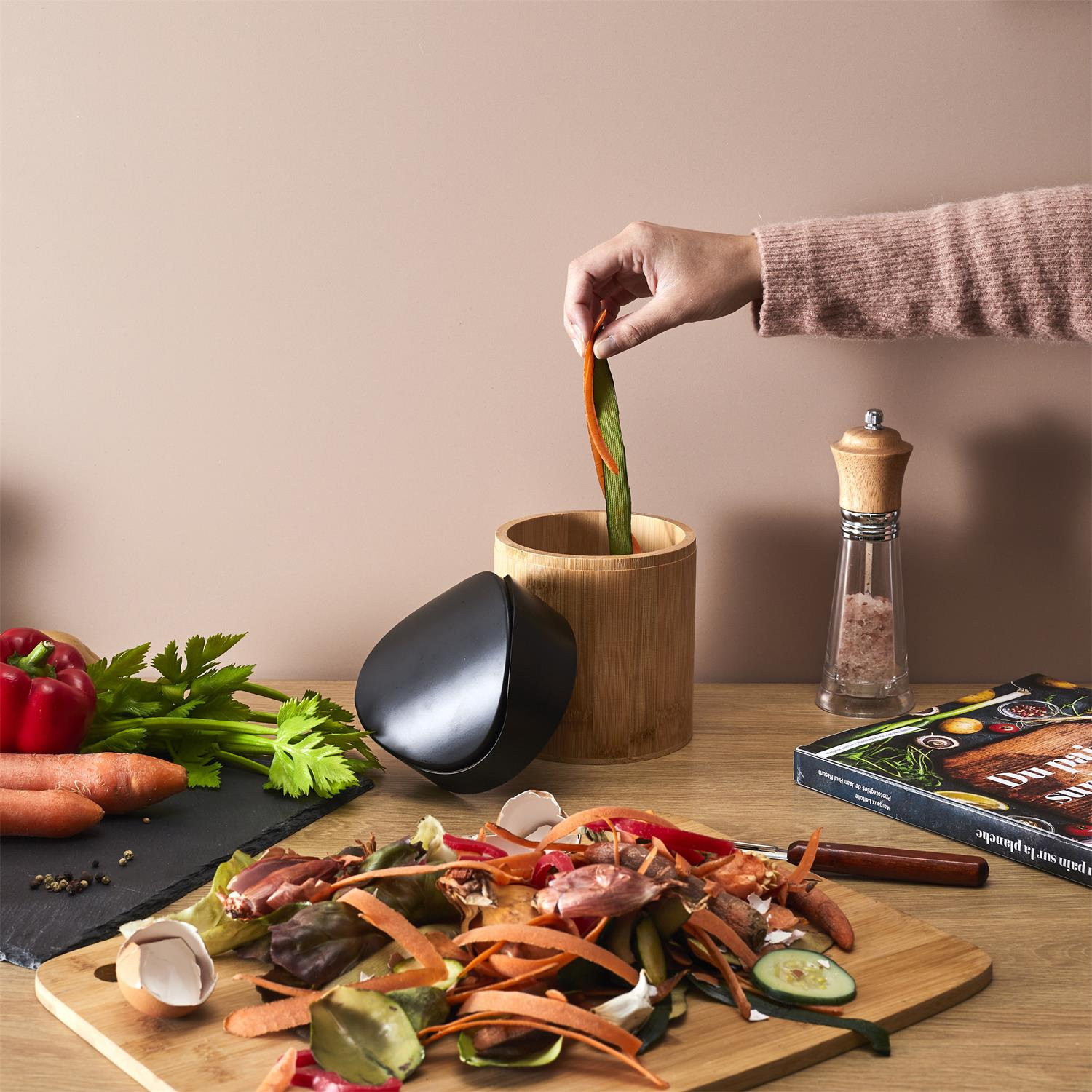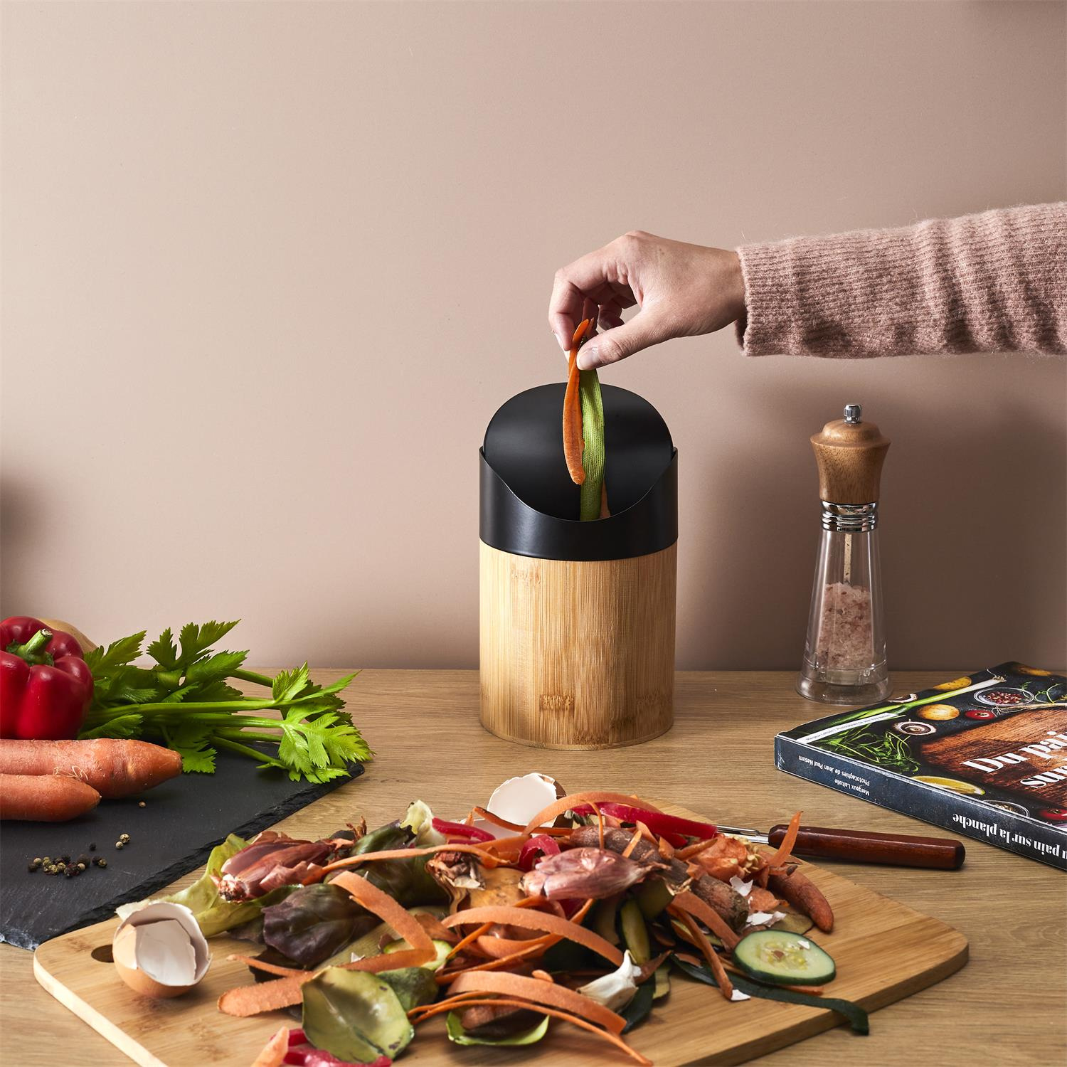 Mini kosz z drewna bambusowego to idealny pojemnik służący jako kompostownik lub na odpady organiczne w kuchni. Mini kosz wyposażony w obrotową pokrywę sprawdzi się podczas przysządzania dań jak i również będzie idealnym mini pojemnikiem na odpady np. w łazience lub w biurze. Pojemnośc 1 litr. Pokrywa z tworzywa sztucznego. Korpus drewno bambusowe.