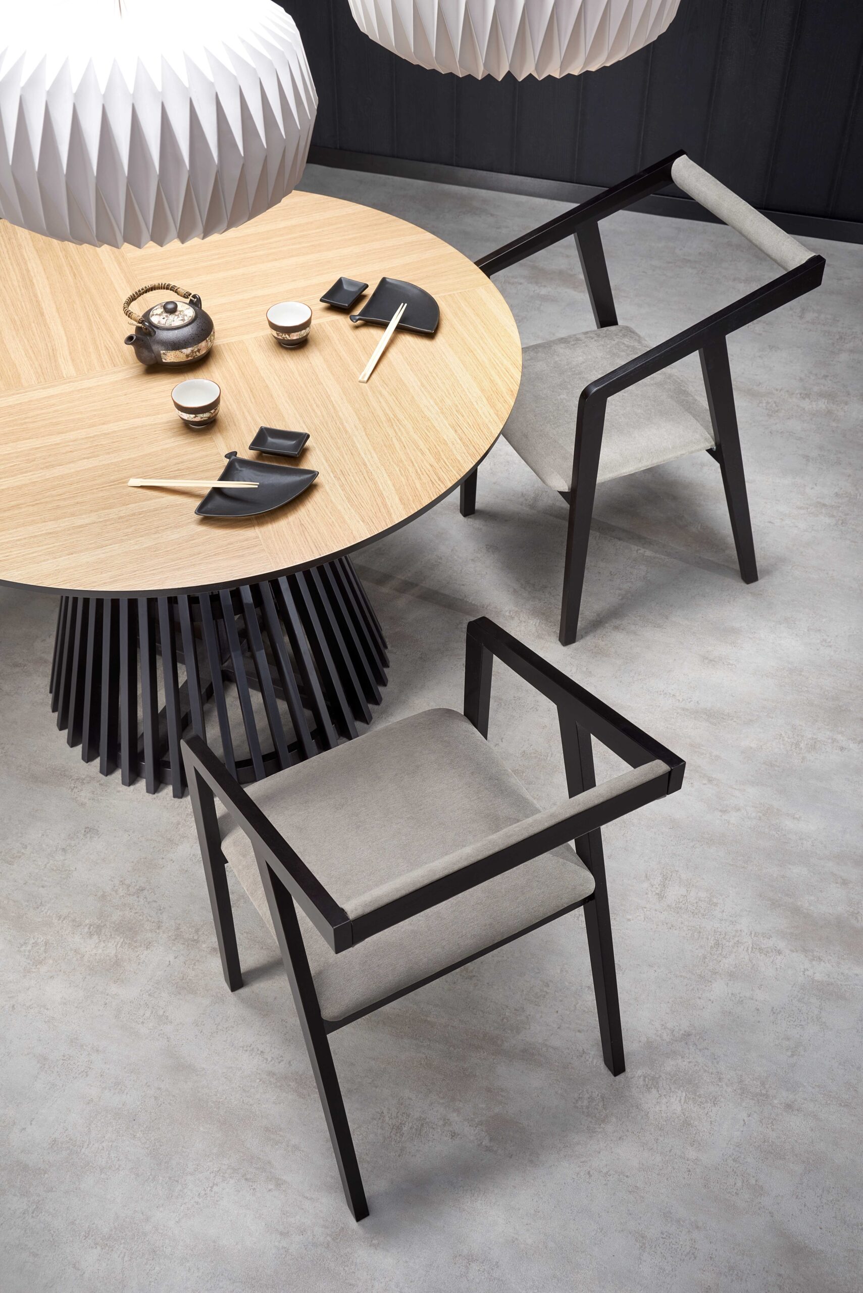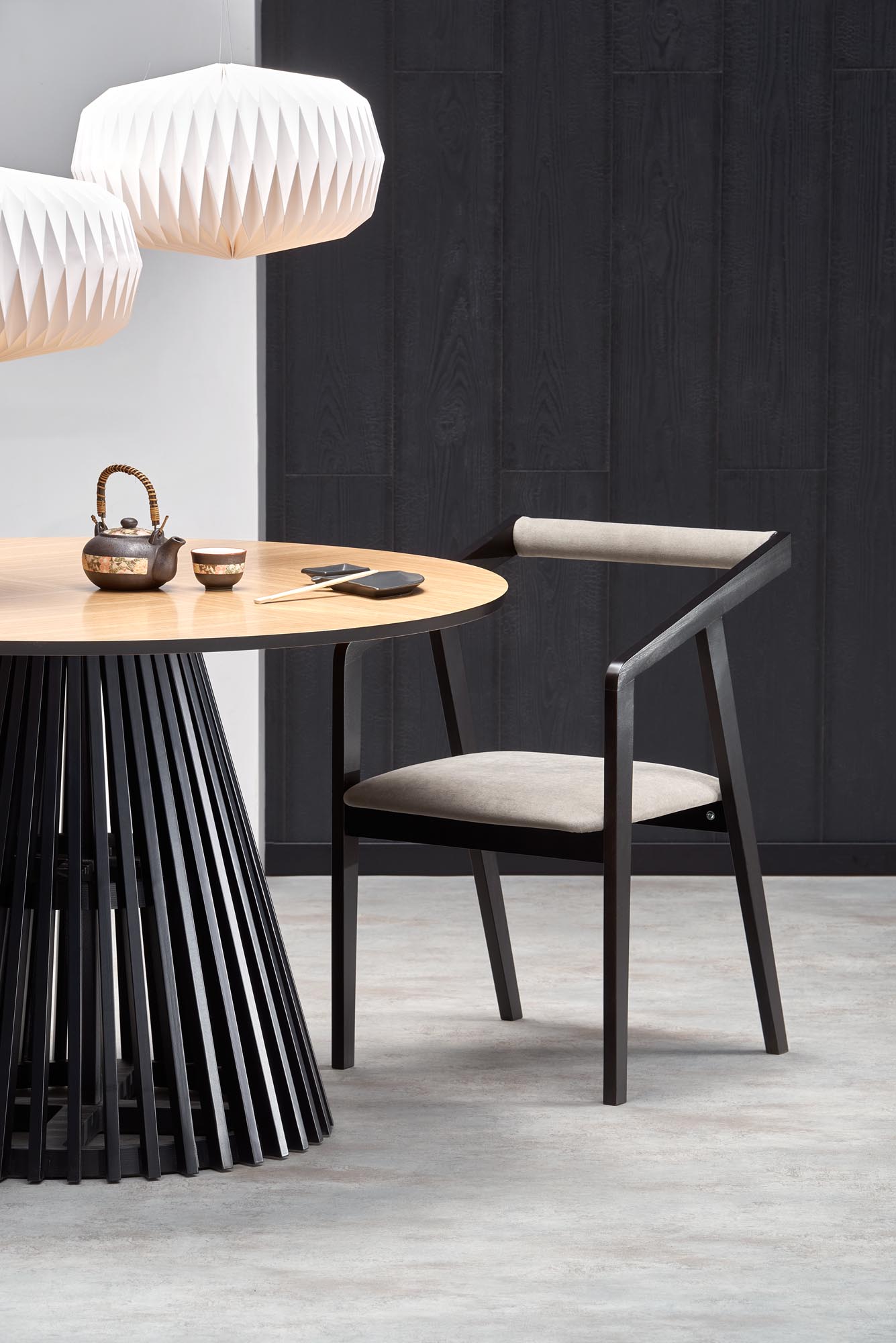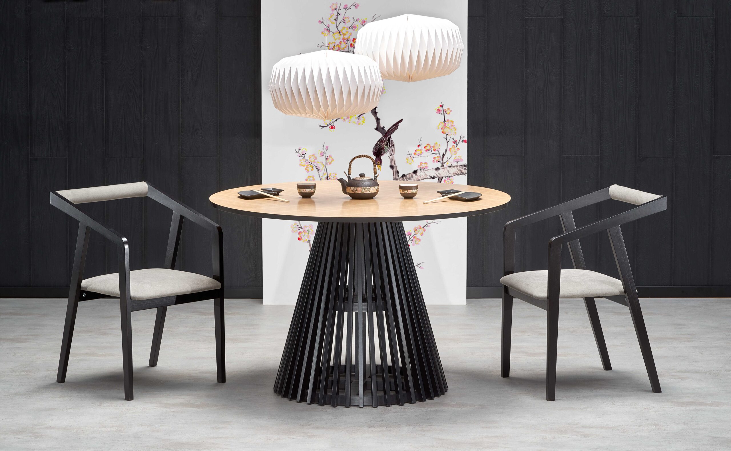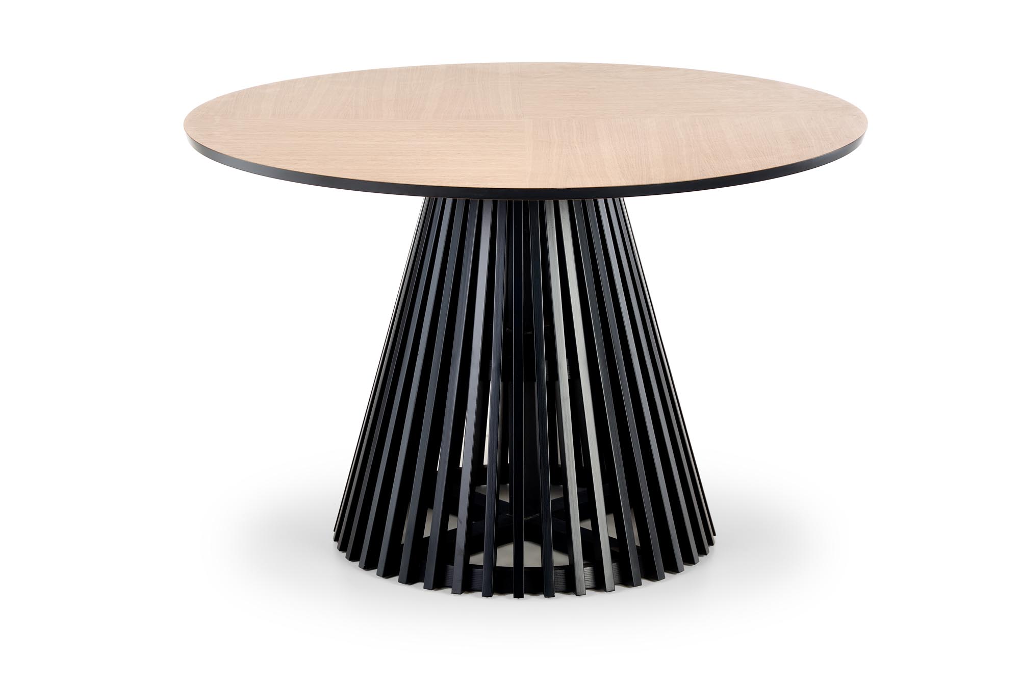 wymiary: fi120/77 cm, materiał: MDF + okleina naturalna – dębowa / drewno lite – bukowe / sklejka, kolor: blat – dąb naturalny, noga – czarny