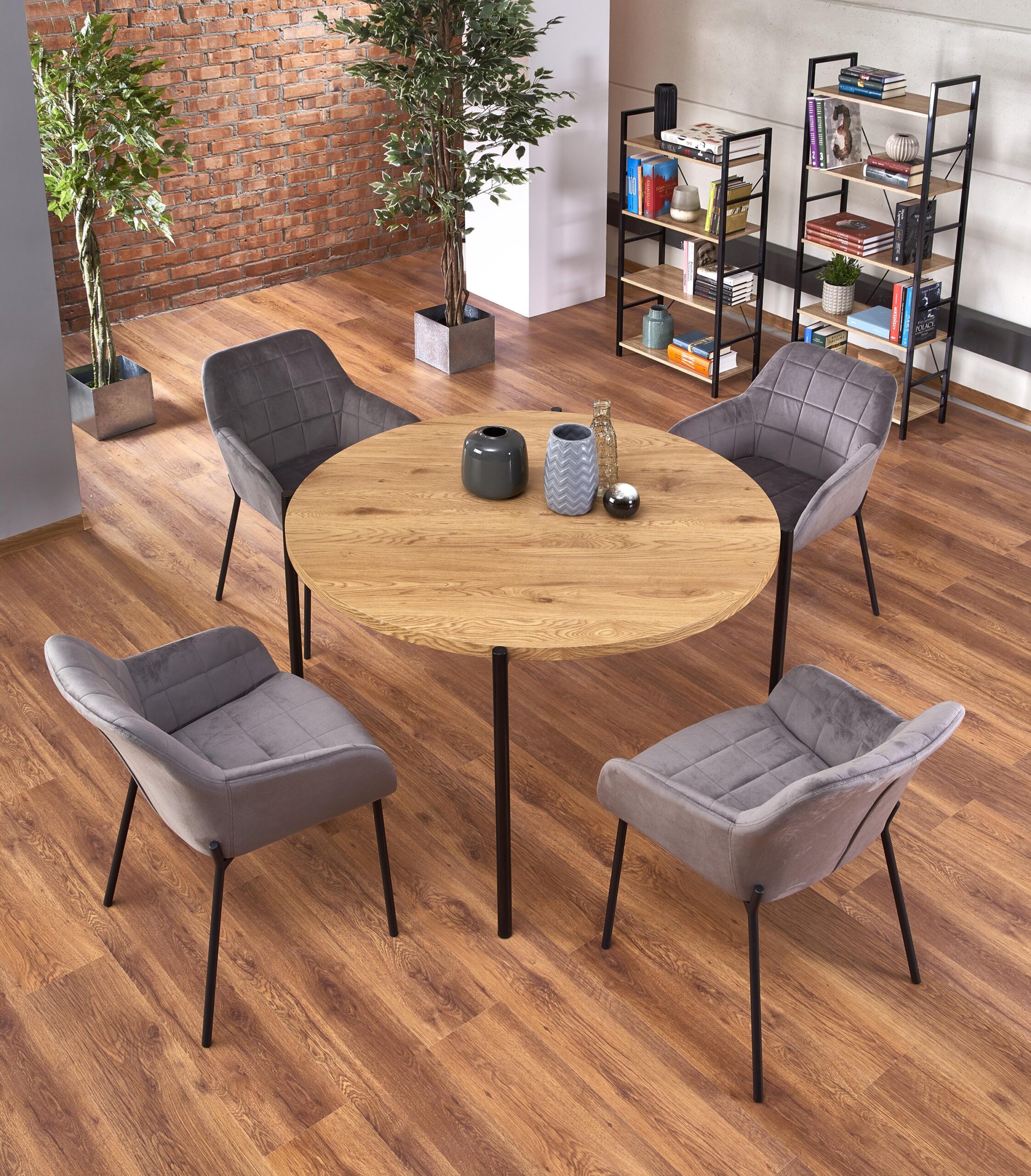 wymiary: fi120/76 cm, materiał: MDF laminowany / stal malowany proszkowo, kolor: blat – dąb złoty, nogi – czarny