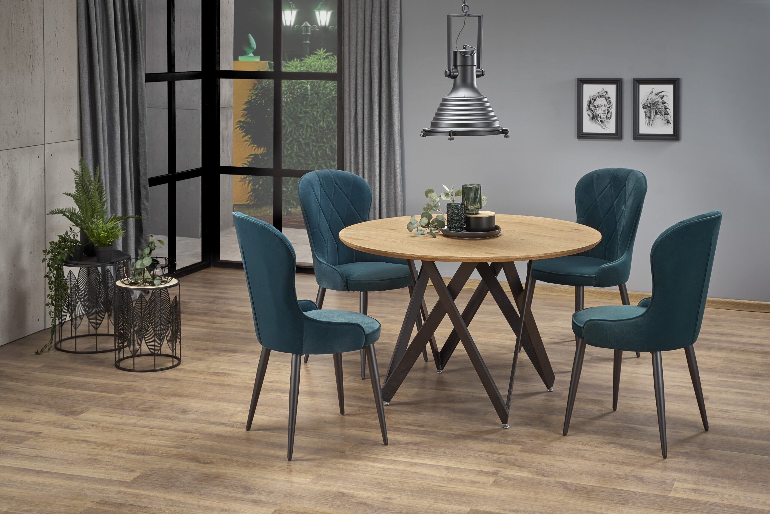 wymiary: o120/75 cm, materiał: MDF okleinowany / stal malowana proszkowo, kolor: blat – dąb złoty, nogi – czarny