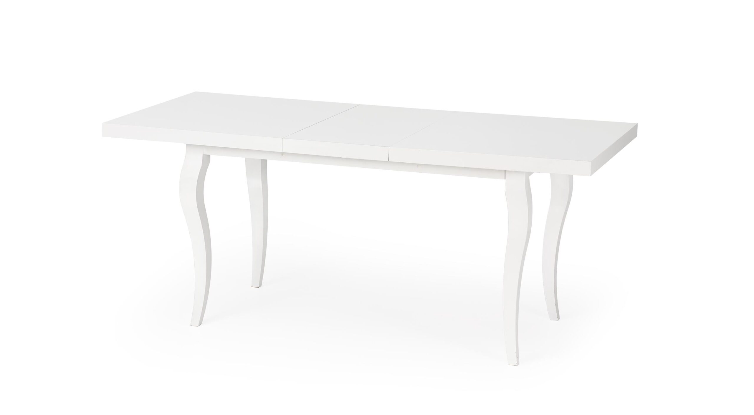 stół rozkładany, wymiary: 160-240/90/75 cm, materiał: blat – płyta MDF laminowana + obrzeża ABS, nogi – drewno lite (bukowe), kolor: biały