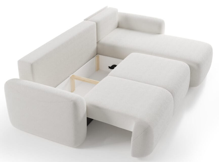 • Mebel został wyposażony w duży pojemnik na pościel, w którym bez problemu zmieścimy komplet pościeli.