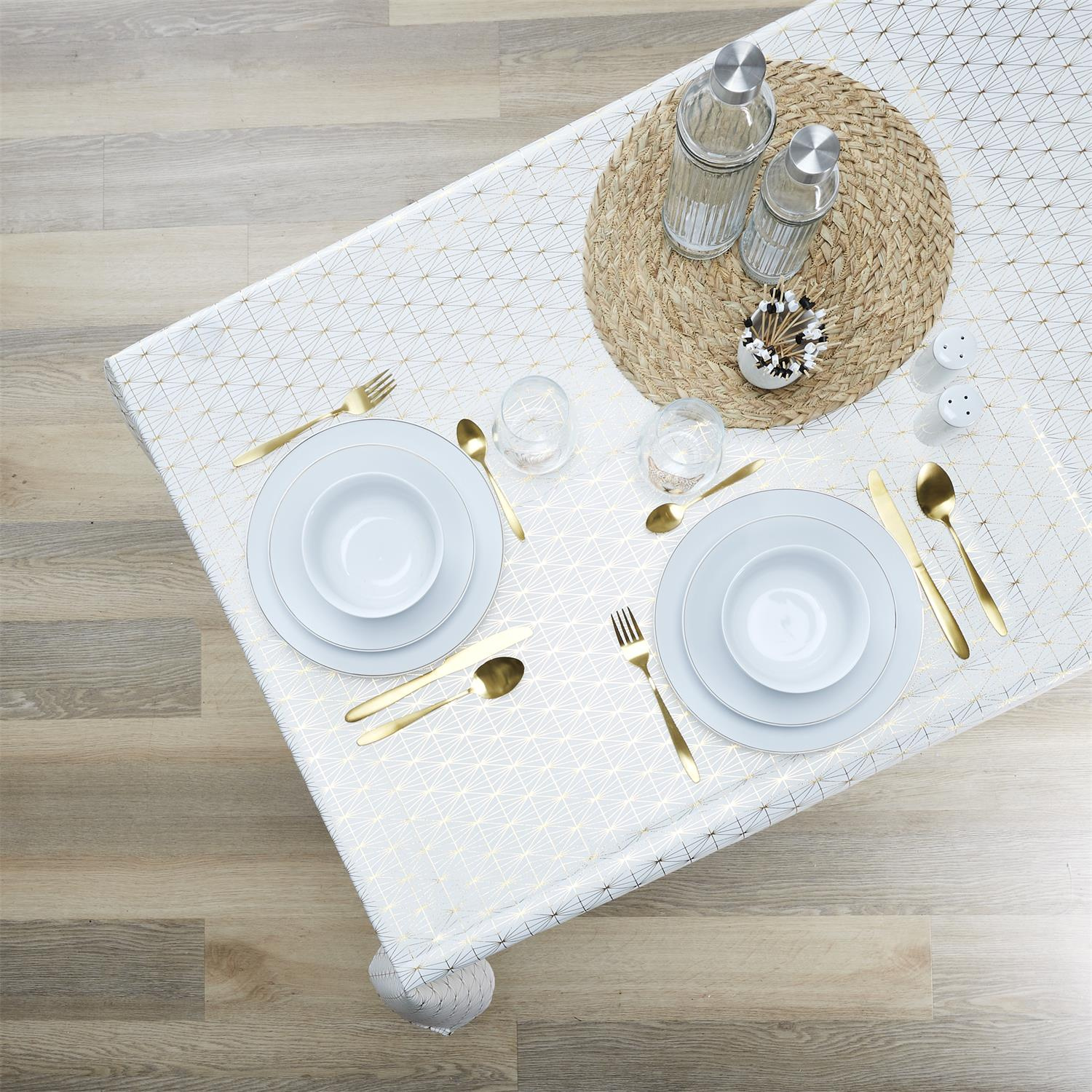 Prostokątny obrus idealny do nakrycia świątecznego stołu. Obrus o białym eleganckim kolorze ozdobiony został delikatnymi, geometrycznymi wzorami.