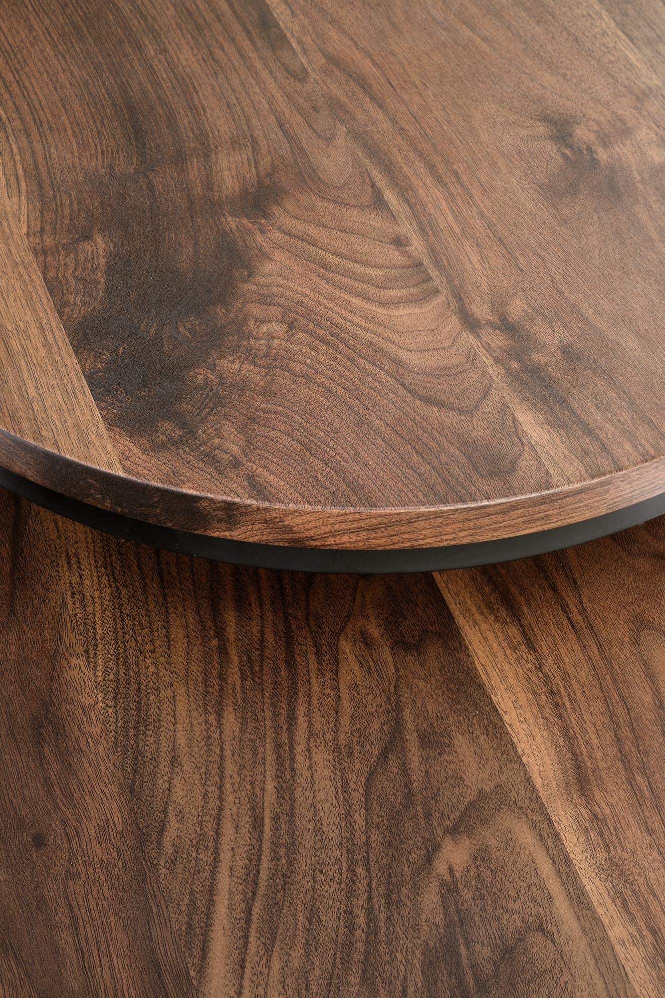 wymiary: duża – fi 53/45 cm, mała – fi 43/35 cm, zestaw 2 ław, materiał: MDF okleinowany / stal malowana proszkowo, kolor: orzechowy/czarny