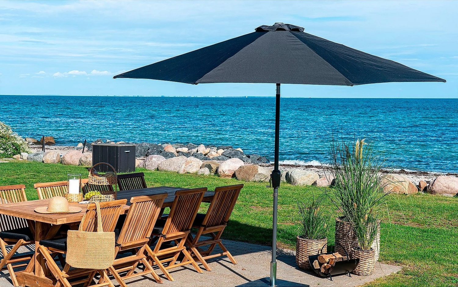 Parasol ogrodowy Houston w kolorze czarnym to doskonały wybór do ogrodu, tarasu lub balkonu. Posiada 38mm metalowy słup oraz 8 metalowych żeber, które zapewniają stabilność i wytrzymałość. Wentylacja powietrza u góry umożliwia lepszy przepływ powietrza, co zapobiega przewracaniu parasola w wietrzne dni. Dzięki mechanizmowi podnoszenia oraz dwóm dzielonym słupom, parasol jest łatwy w obsłudze i przechowywaniu. Wysoka odporność materiału na odbarwienia od promieniowania słonecznego zapewnia długotrwałą estetykę parasola. Piaskowany słupek dodaje elegancji i stylu, sprawiając, że parasol doskonale komponuje się w różnych przestrzeniach zewnętrznych.