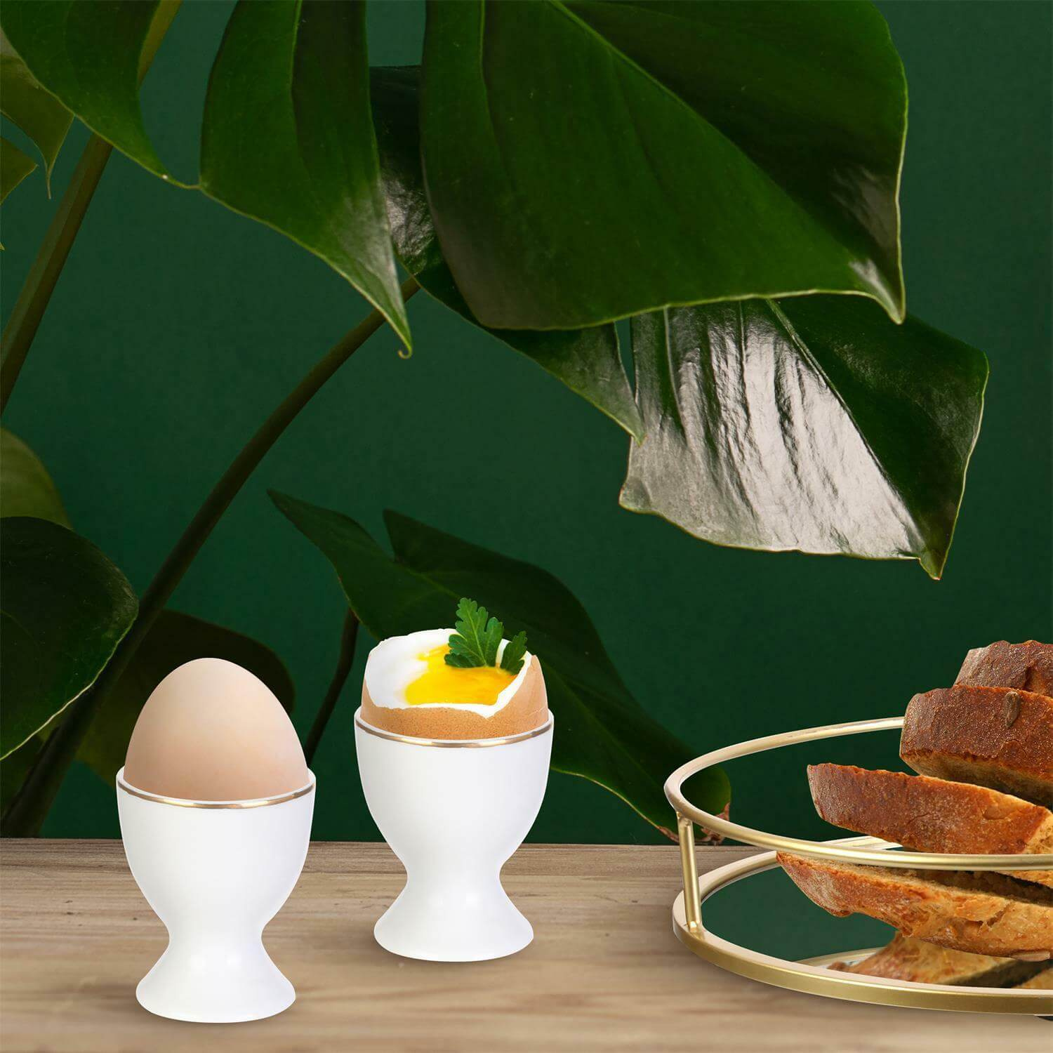 Podstawka na jajka ze złotą obwódką wzbogaci delektowanie się śniadaniem w bardzo eleganckim stylu. Seria Pearl Gold to piękna biała porcelana ze złotymi obrzeżami, która sama w sobie jest ozdobą i tworzy elegancki klimat podczas posiłku. W skład kolekcji Pearl Gold wchodzą talerze, kubki oraz inne akcesoria spójne z kolekcją. Porcelana z kolekcji Pearl Gold nadaje się domycia w zmywarce. Skład: Porcelana – Wymiary: 4,8 x 4,8 x 7,2 cm