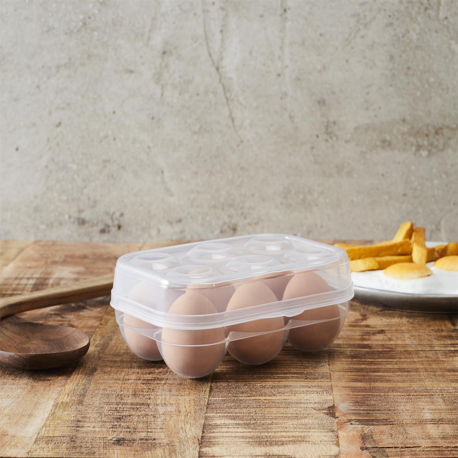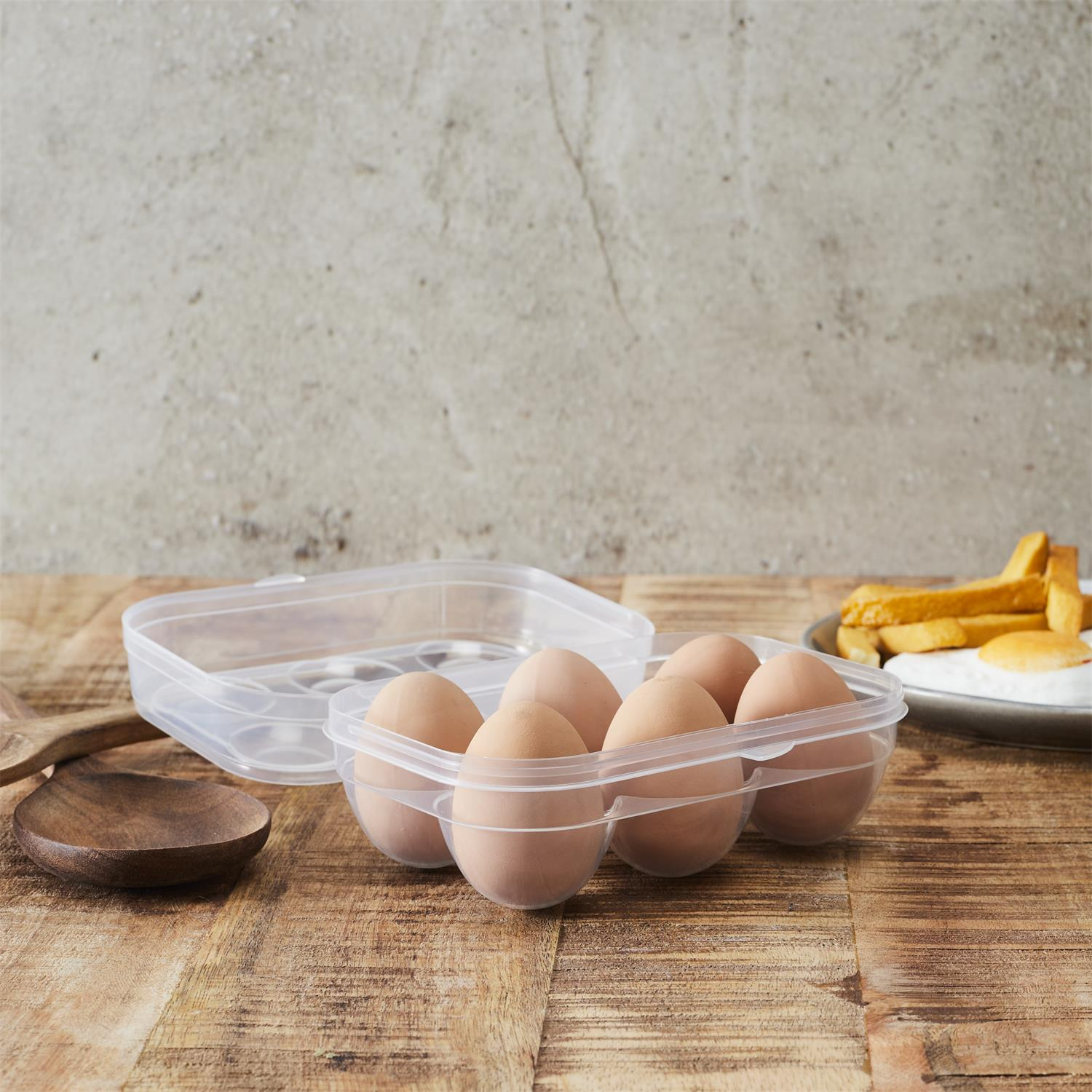 Pojemnik na 6 jajek wykonany został z tworzywa sztucznego. Pojemnik zamykany z przegródkami gwarantuje bezpieczny transport jajek oraz przechowywanie ich w lodówce.