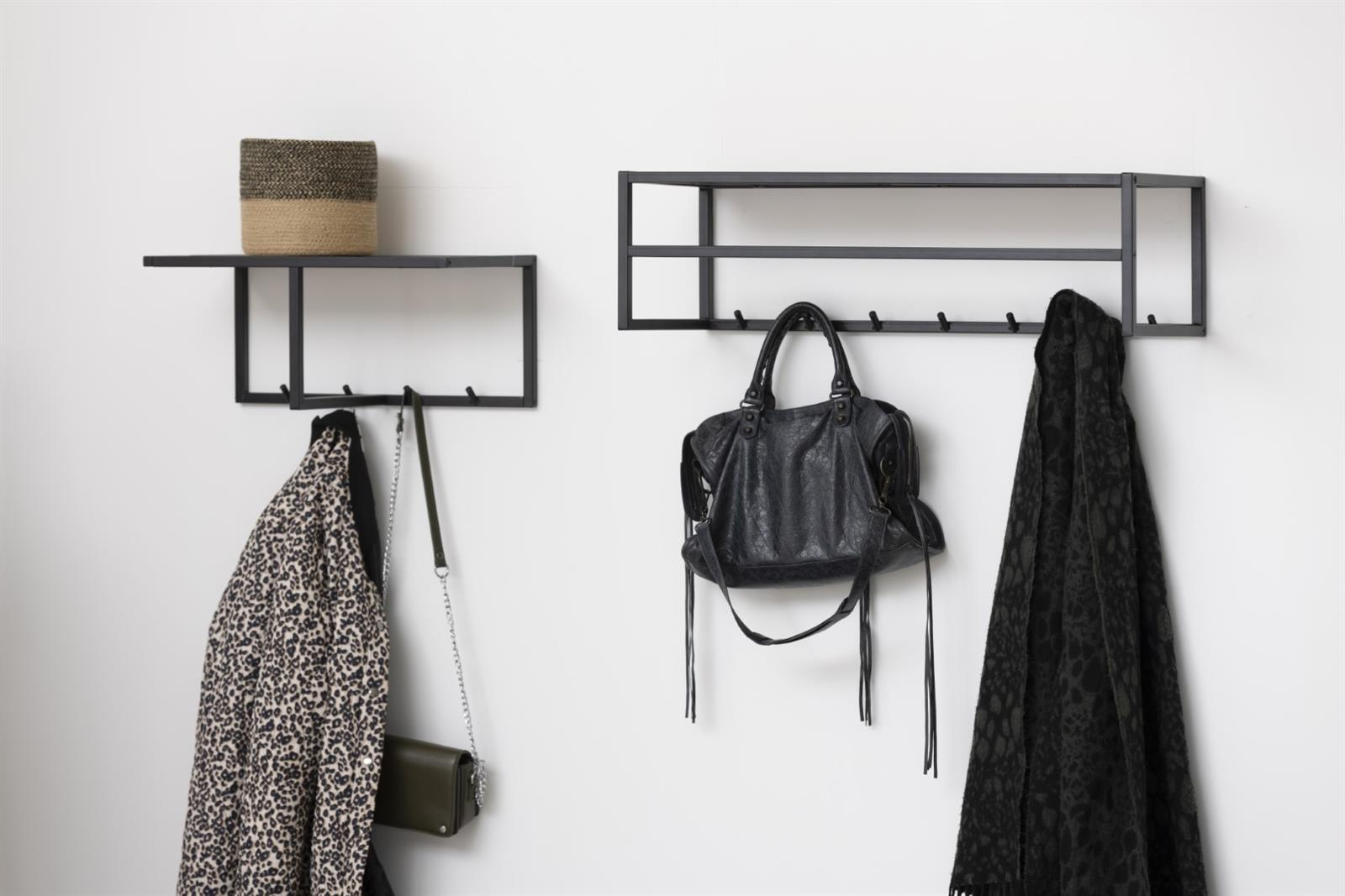 Półka z wieszakiem Seaford to świetny pomysł na stworzenie dodatkowego miejsca do przechowywania w przedpokoju. Na półkę składa się konstukcja z metalu malowanego proszkowo na kolor czarny oraz płyta MDF w okleinie w kolorze czarnym. Półka posiada siedem haczyków na ubrania oraz metalową poprzeczkę, na której można zawiesić takie elementy odzieży jak np. kurtki. Ilość kartonów: 1 Wymiary kartonów: 80,5x32x6,5cm Waga kartonów: 4,5kg