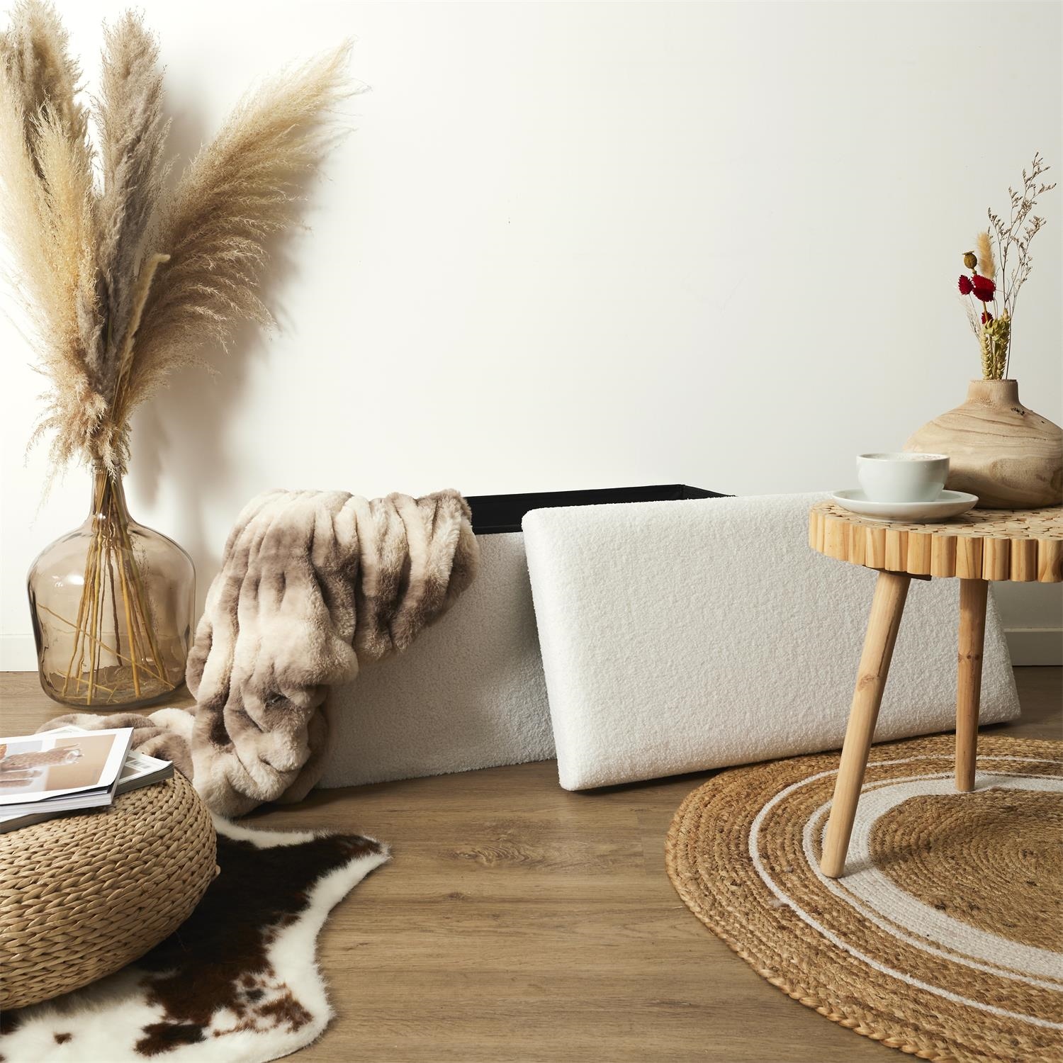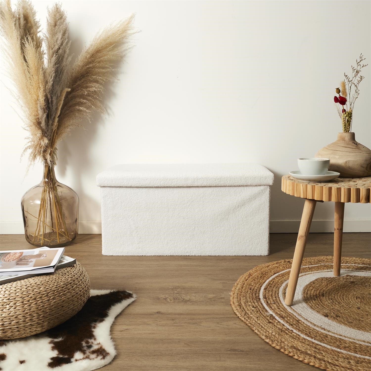 Składana pufa marki Intesi, to ponadczasowy dodatek do wnętrza. Pufa obita przyjemną w dotyku i dla wzroku tkaniną boucle. Pufa nie tylko schowa nasze drobiazgi ale może służyć również jako siedzisko. Pufa jest składana, więc gdy jej nie używamy zajmuje ona mało miejsca. Materiał: MDF, tkanina boucle, pianka tapicerska