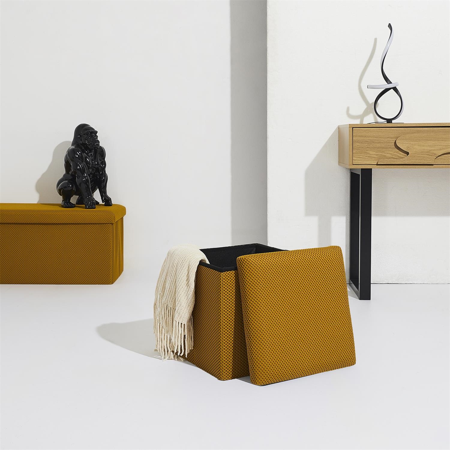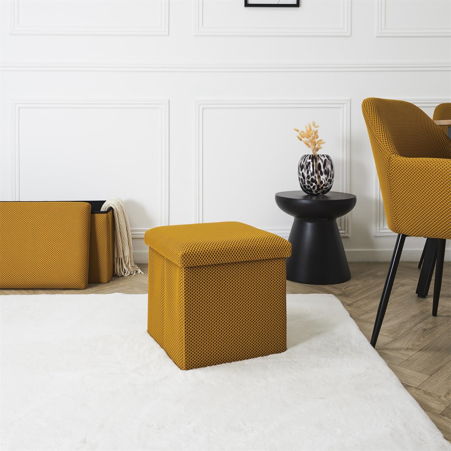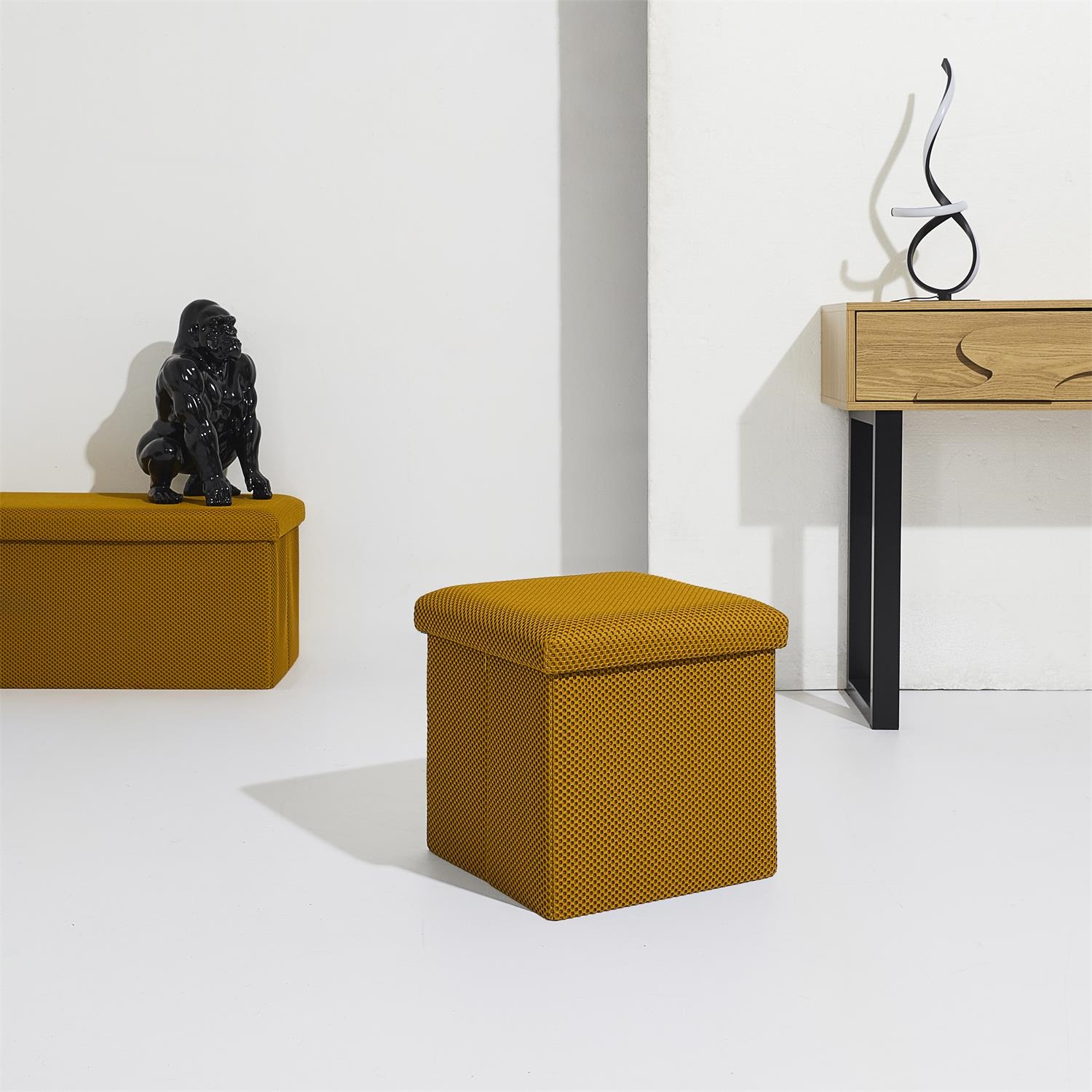 Składana pufa ze schowkiem to must have każdego mieszkania studenta lub osób, które potrzebują dodatkowego siedziska oraz miejsca do przechowywania. Pufa wykonana ze stelaża z wytrzymałej płyty MDF, która gwarantuje maksymalne dopuszczalne obciążenie mebla aż do 110kg. Pufę można złożyć gdy jej nie używamy. Po rozłożeniu natomiast daje nam sporo miejsca do przechowywania zarówno mniejszych rzeczy jak i sporych takich jak koce, buty lub książki. Pufa ozdobiona została ciekawą trójwymiarową tkaniną. Tkanina 100% poliester.