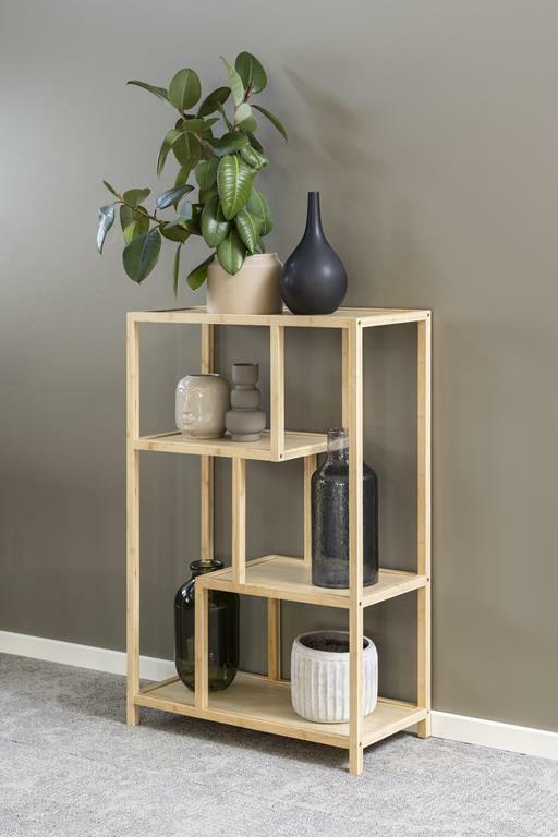Regał Moso, wykonany w całości z bambusa, zapewnia delikatną estetykę, ale także trwałość. Dzięki asymetrycznym detalom ten regał jest jednym z tych, na które warto zwrócić uwagę. Oferuje 2 półki, na których można wyeksponować ulubione przedmioty i dekoracje. Ten regał ma nowoczesny klimat i łatwo integruje się z każdym domem.