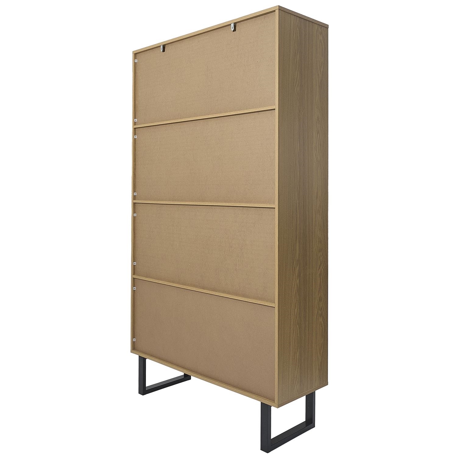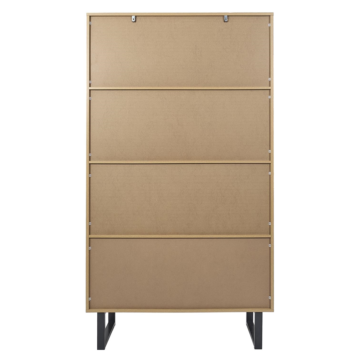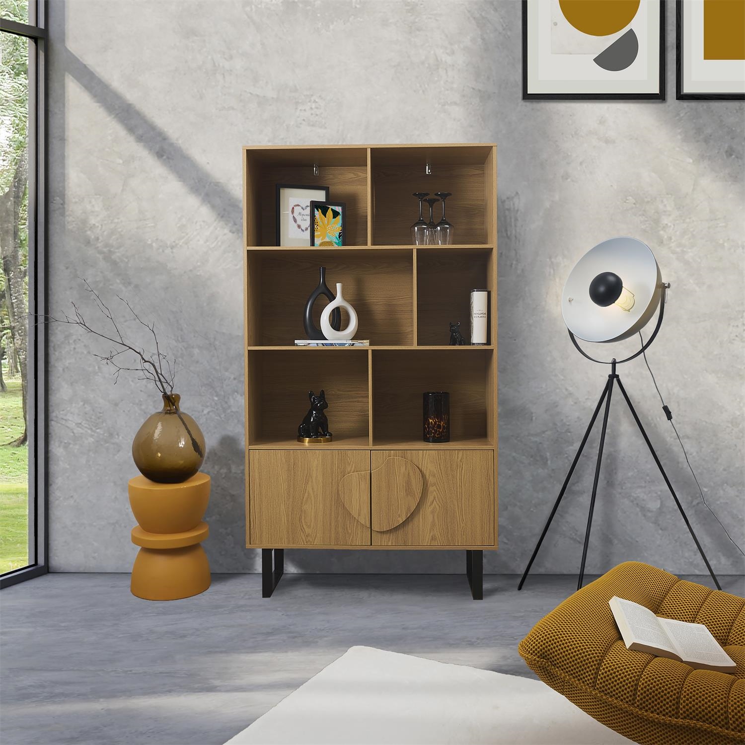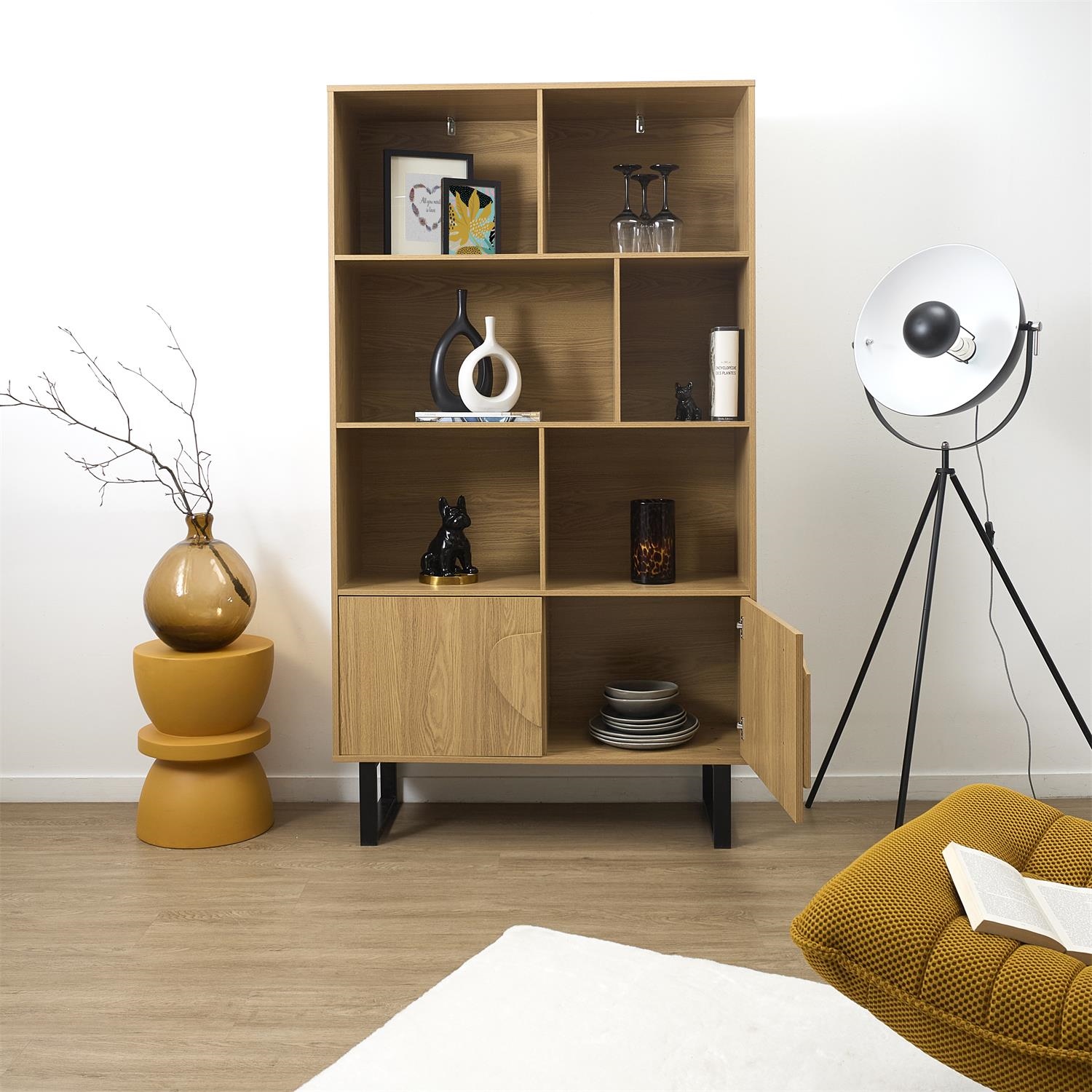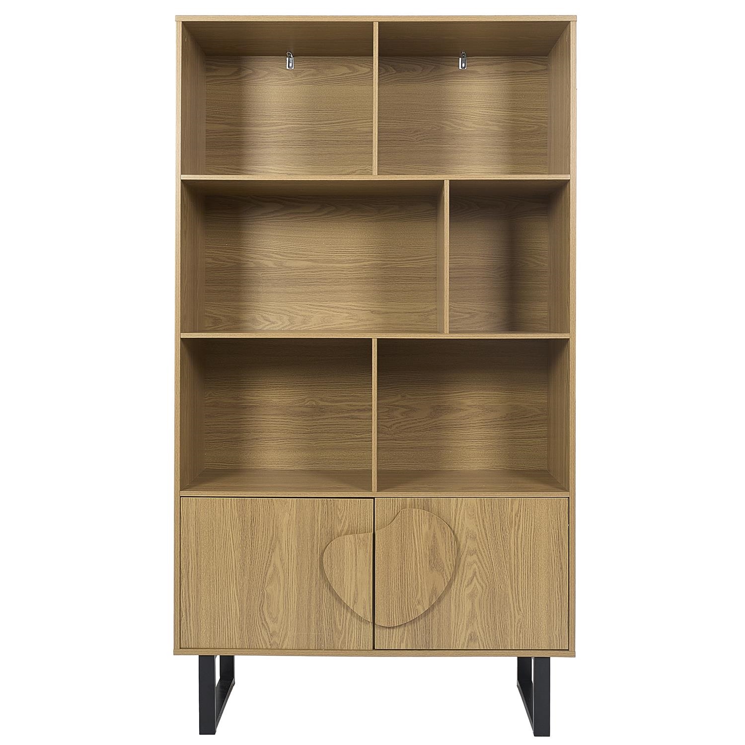 Regał na książki z serii Calypso to ponadczasowy mebel, który sprawdzi się w salonie pełnym książek. Regał wykonany z wytrzymałej płyty MDF w okleinie imitującej drewno. Regał charakteryzuje się niesymetrycznymi półkami oraz szafką z 2 frontami. Na froncie widoczna jest obła, niesymetryczna ozdoba. Nogi regały to malowane proszkowo na czarno dwie metalowe płozy. Wysokie nogi regału umożliwiają łatwe sprzątanie pod meblem. Każdy odkurzacz powinien móc wjechac pod regał. Regał wymaga montażu. Max. obciązenie na półkę 5kg Waga mebla 42,2 kg
