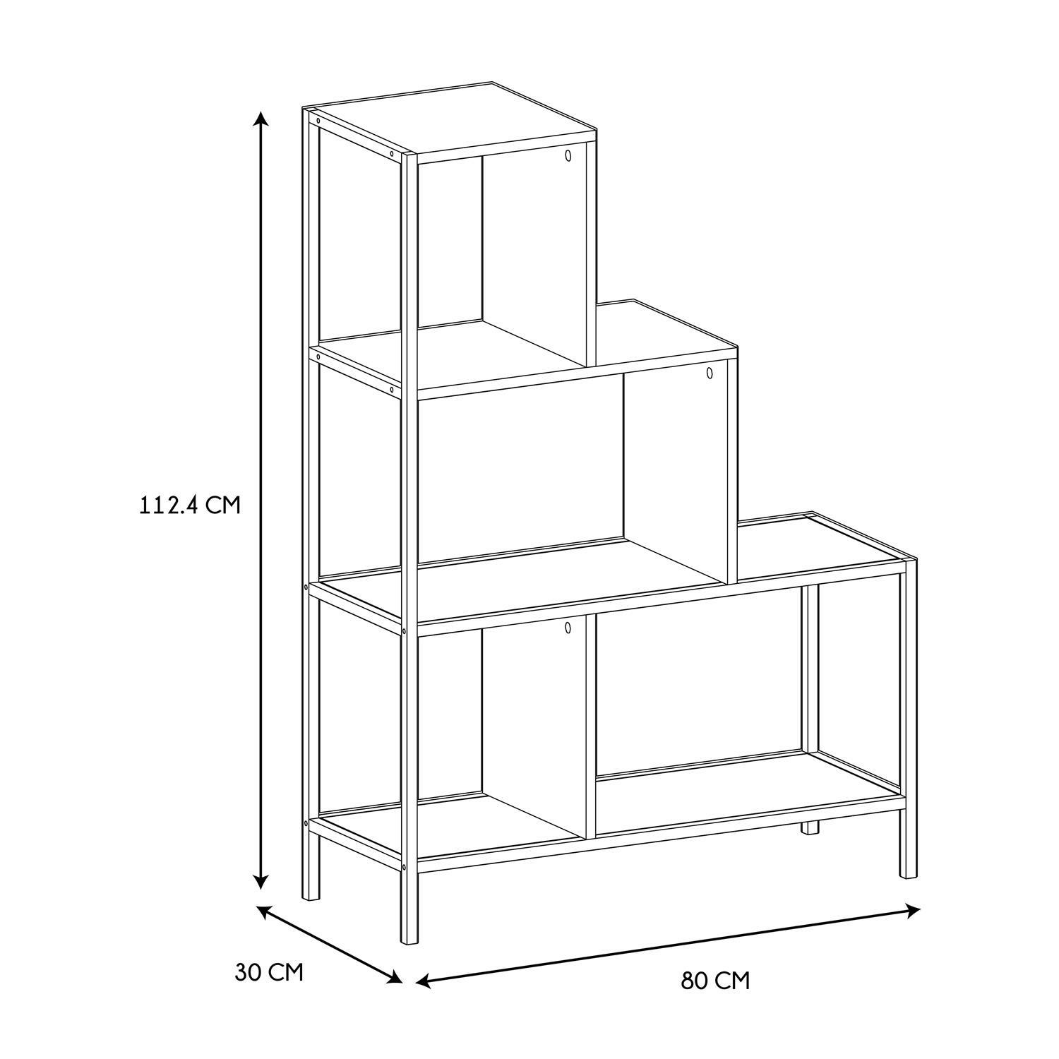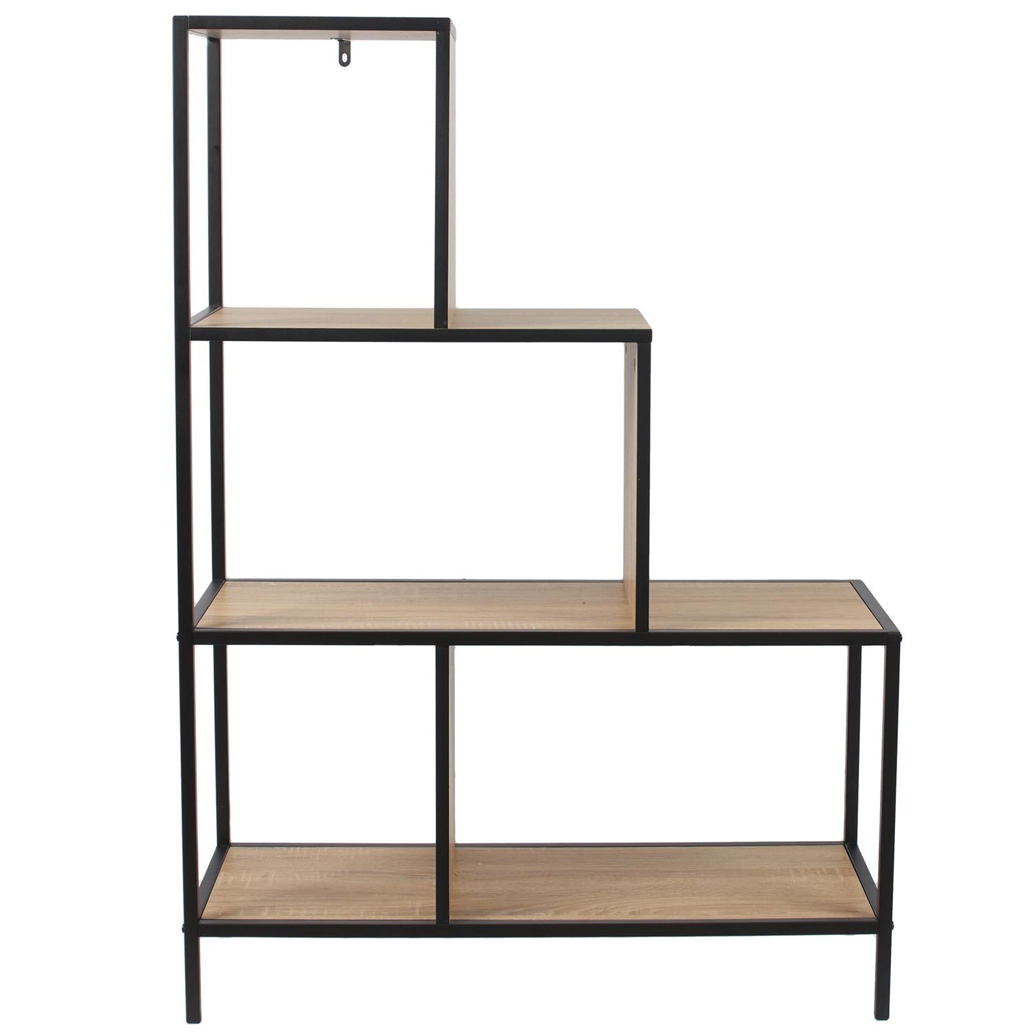 Schodkowy regał to przede wszystkim inspirujący mebel na nasza biblioteczkę. Regał o nieregularnym kształcie sam w sobie dodaje stylu we wnętrzu. Regał wykonany został z metalu malowanego proszkowo na czarno oraz półek z płyty MDF w okleinie imitującej dąb. Max. obciżenie na półkę 5kg Wymaga montażu. Wymiary kartonu: 37x12x109cm Waga 11kg