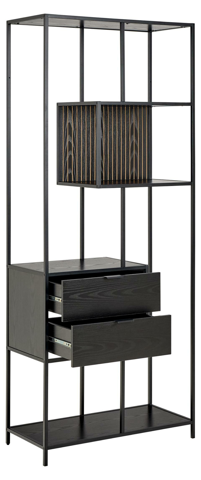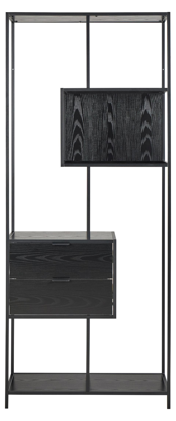 Wykonany z czarnej stalowej ramy, ten regał jest atrakcyjny wizualnie dzięki asymetrycznym detalom i odwracalnemu panelowi tylnemu. Wyposażony w 2 szuflady i 4 półki w kolorze czarnego jesionu z łatwą w pielęgnacji powierzchnią, jest idealnym miejscem do przechowywania książek, gier i dekoracji, które zasługują na wyeksponowanie.