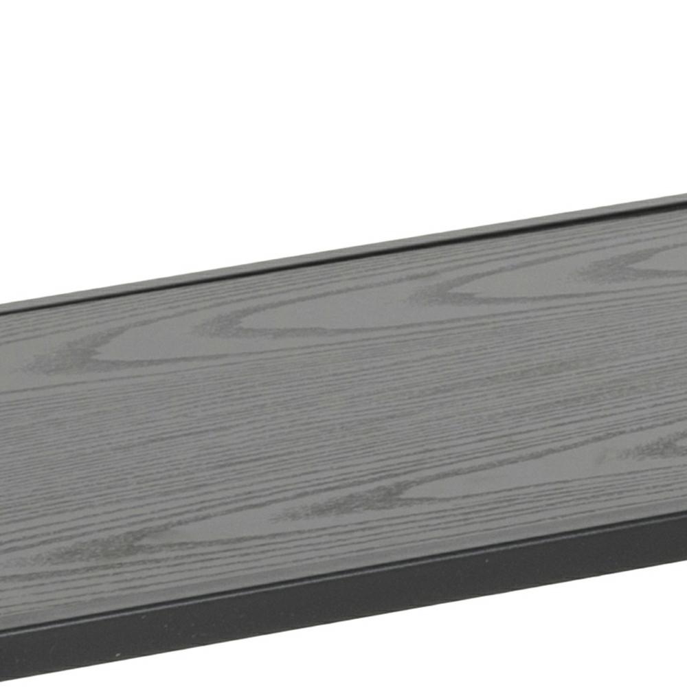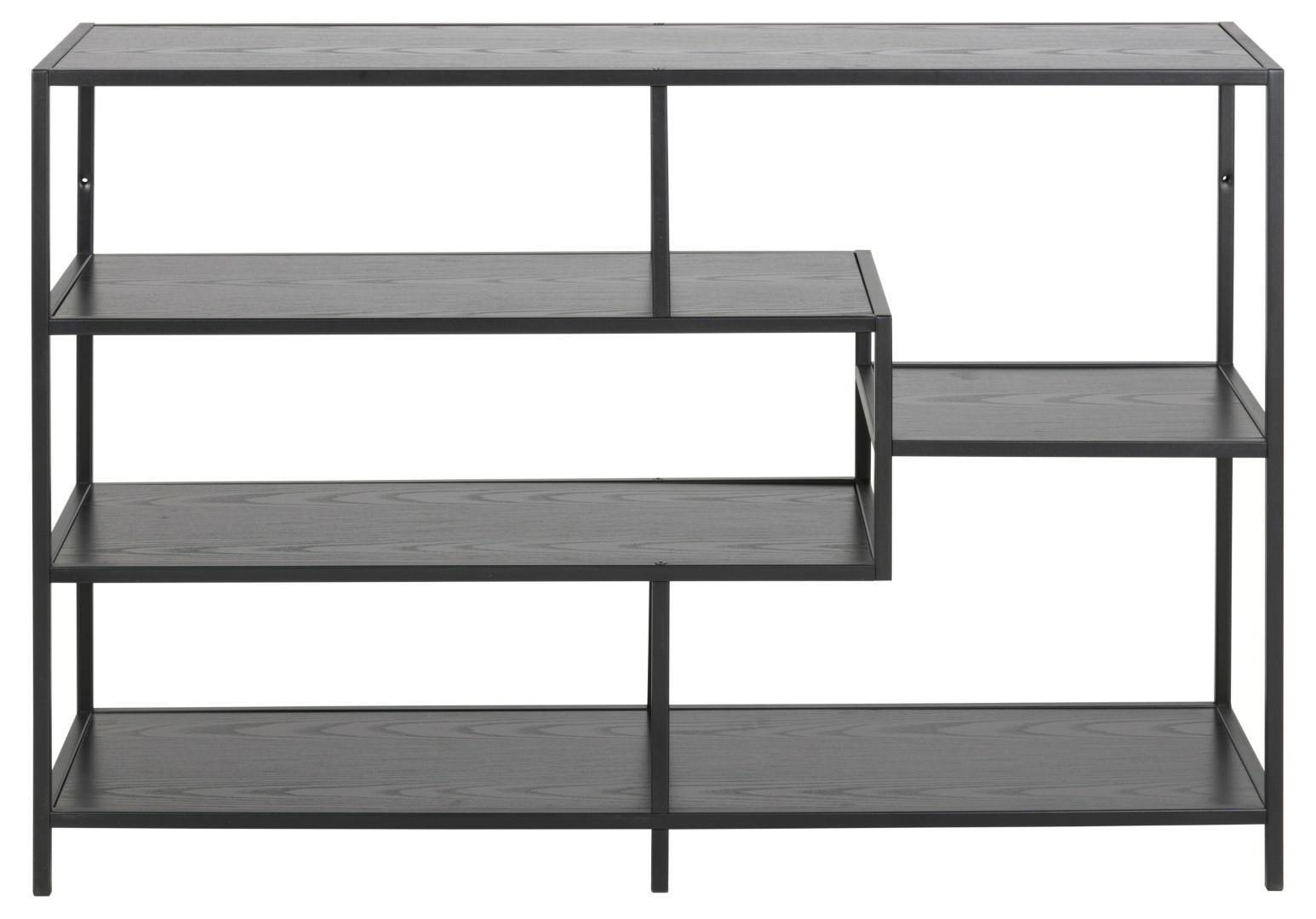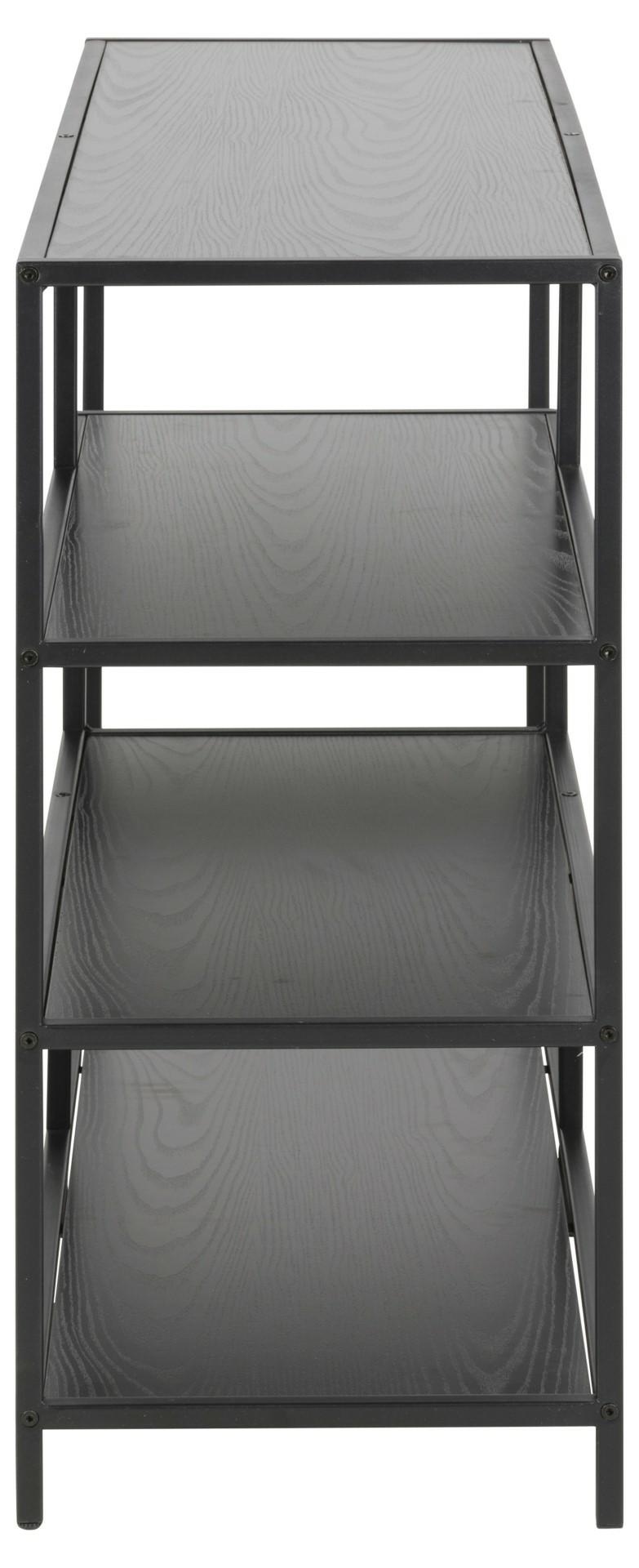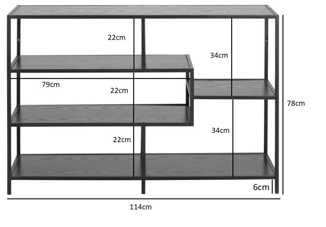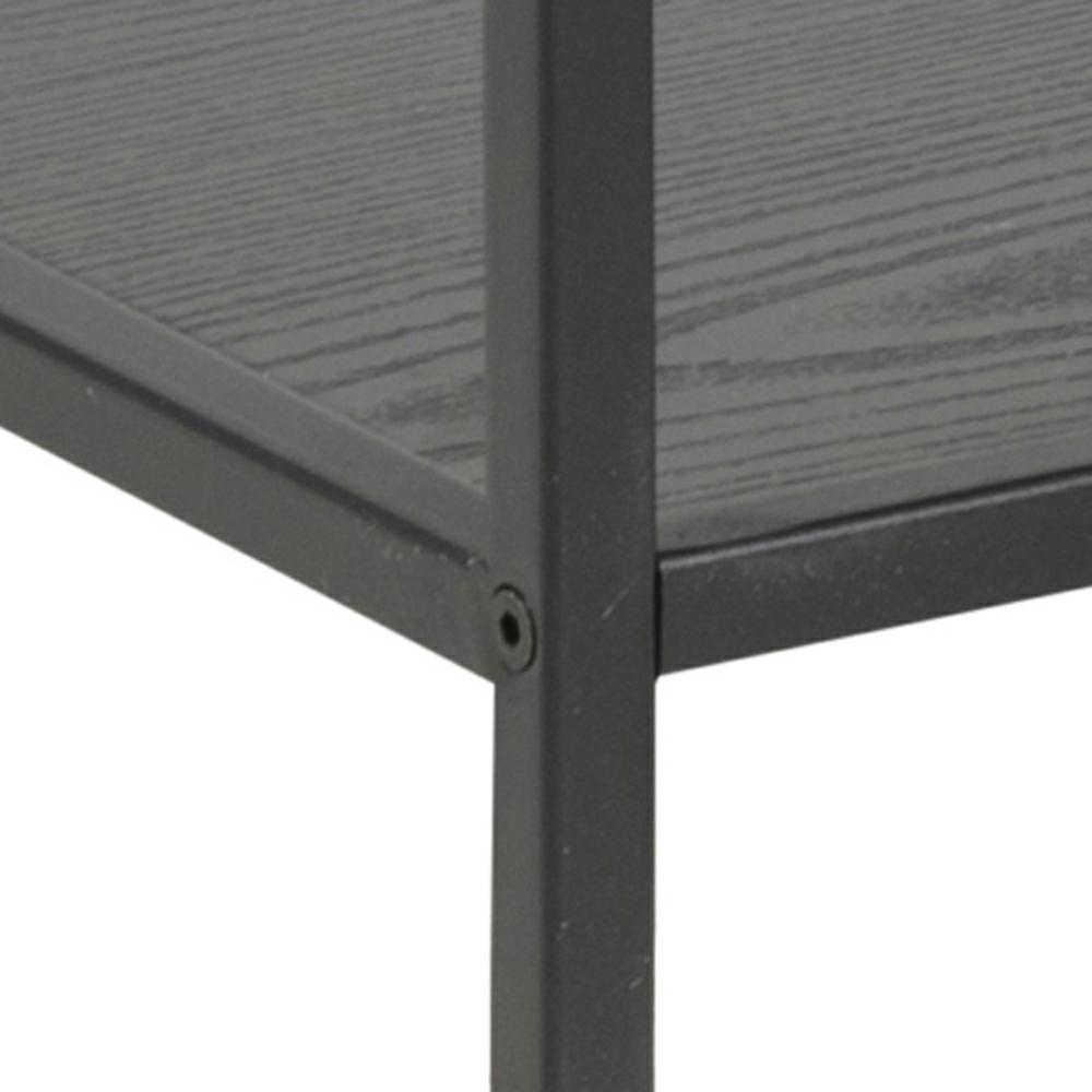 Regał Seaford został zrobiony z wytrzymałego metalowego szkieletu oraz trzech mniejszych i dwóch większych półek z MDF oklejonych okleiną. Metalowa konstrukcja została pomalowana proszkowo na czarno. Jej matowe wykończenie nadaje całości elegancji. Czarna okleina na półkach idealnie współgra z czarnym kolorem konstrukcji. Regał stoi na niewysokich nóżkach. Waga: 17,9 kg. Wymiary kartonu: 14cm x 117cm x 38cm