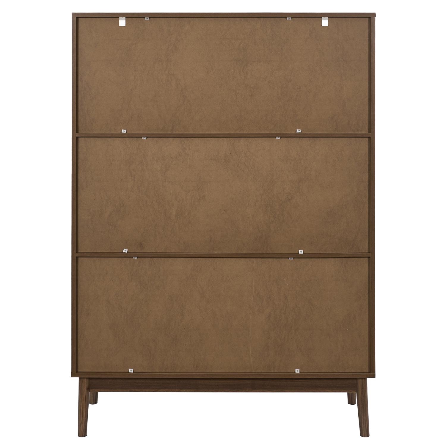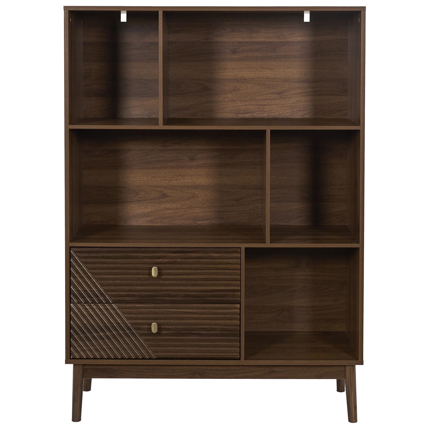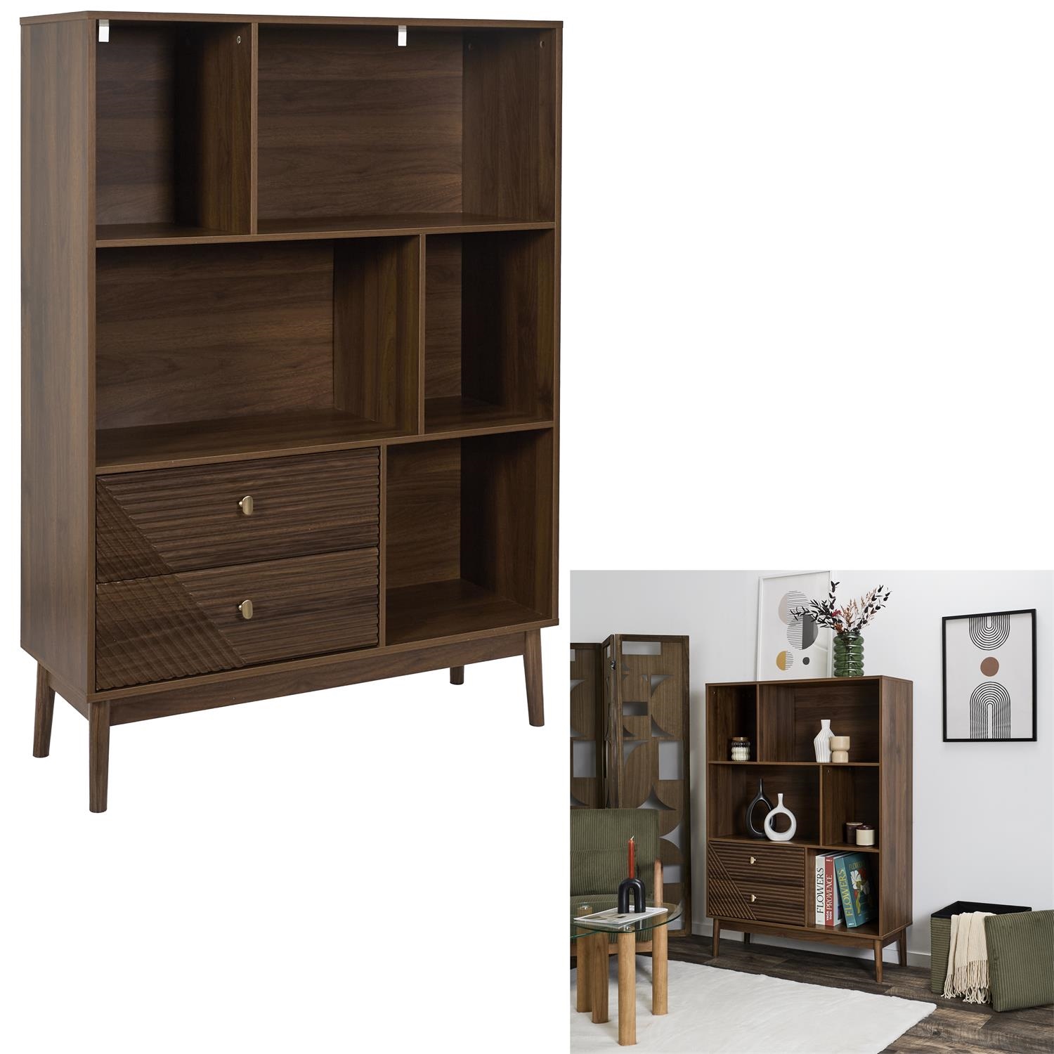 Regał wymaga montażu Materiał: Płyta MDFw okleinie imitującej orzech. Nogi drewno sosnowe, uchwyty metal. Komoda wyposażona w 2 szuflady na metalowyc kulkowych prowadnicach. Asymetryczne półki dodadza meblowi nowoczesnego wyglądu Max. obciążenie mebla 50kg.