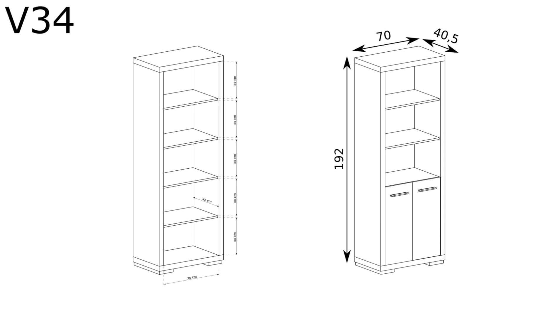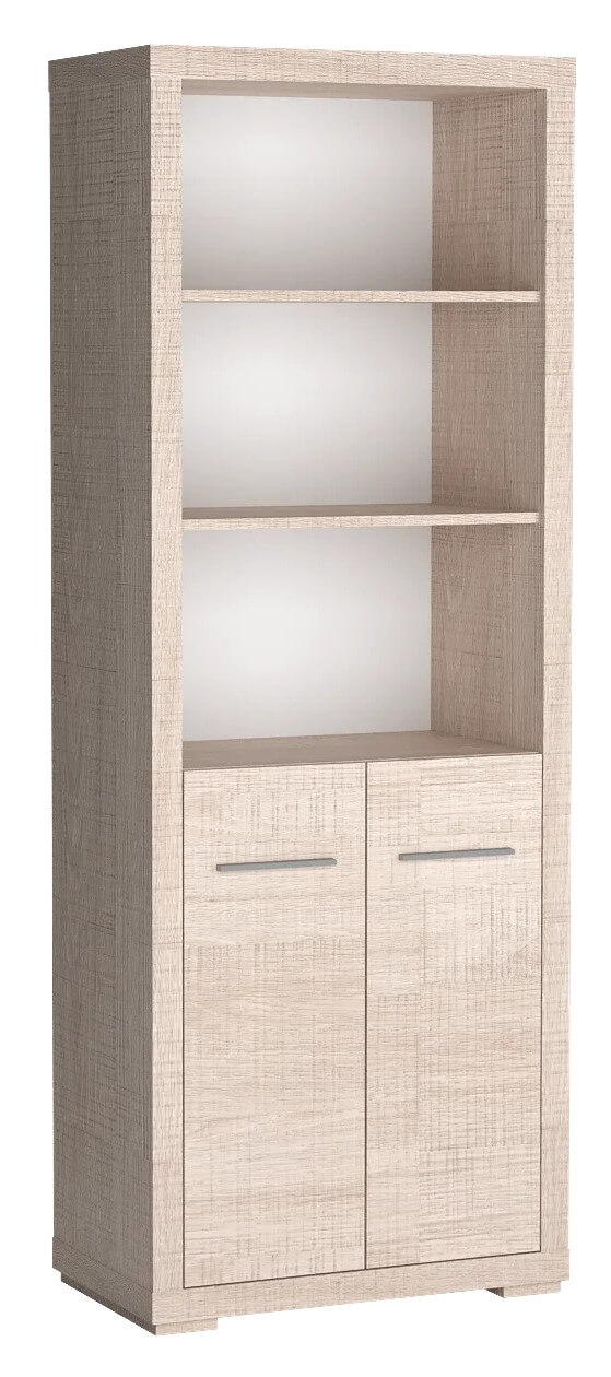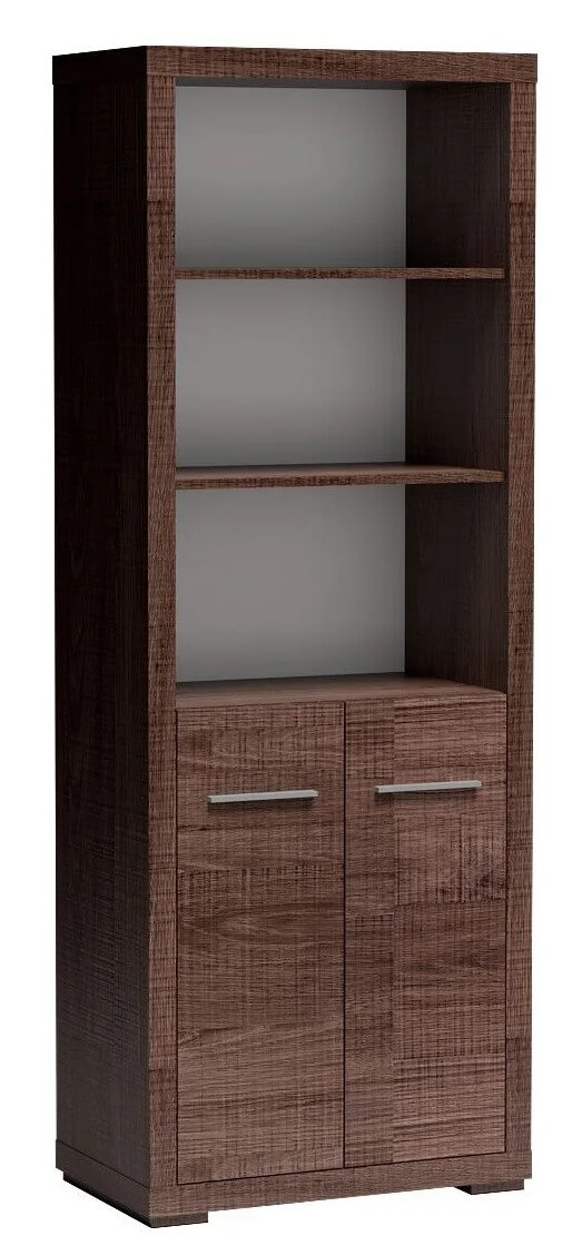 Regał z kolekcji Vegas. Posiada dwie duże pojemne półki, które są otwarte, przez co są idealne do eksponowania książek, ozdób czy pamiątek. Mebel posiada również dwoje drzwi z jedną półką w środku, idealne do schowania rzeczy przed światłem dziennym. Regał wpasuje się w każdą aranżację, do pokoju wprowadzi ciepły i miły nastrój. Metalowe uchwyty uwydatniają stanowczość i elegancje mebla. Dostępny w dwóch wybarwieniach.