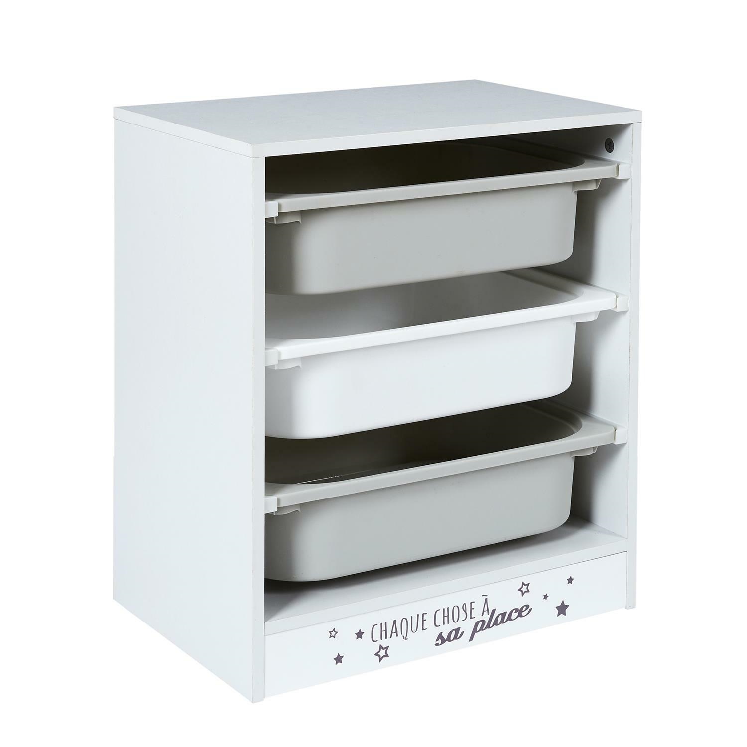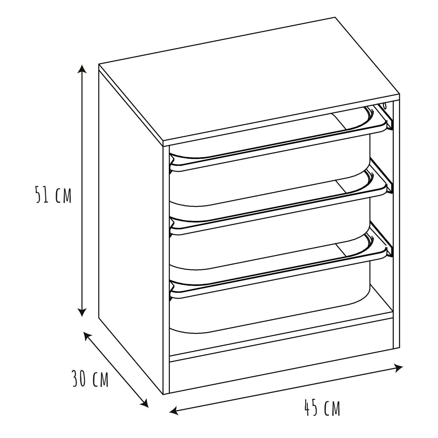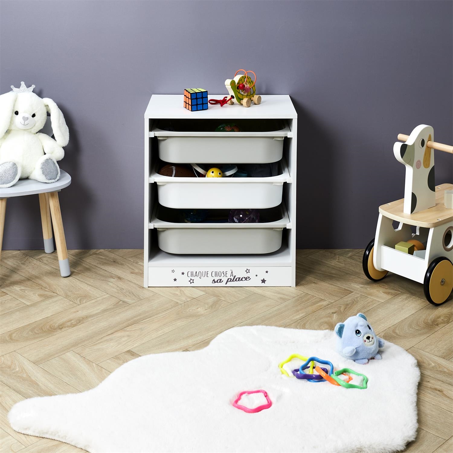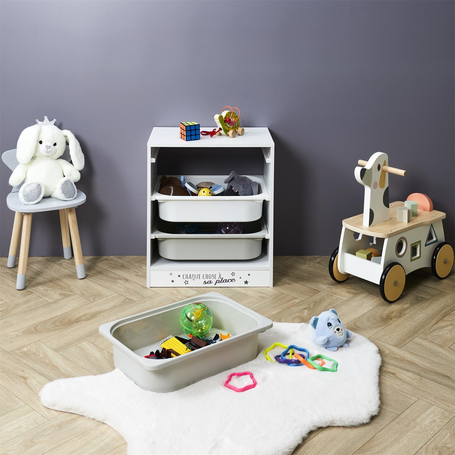 Regał z 4 pojemnikami sprawdzi się w pokoju dziecka na zabawki, gry planszowe lub pluszaki. Dziecięcy regał w kolorze białym wyposażony został w dwa małe pojemniki w kolorze białym, jeden maly pojemnik w kolorze szarym oraz duży szary pojemnik. Korpus regału wykonany został z płyty meblowej. Mebel wymaga montażu. Wymiary opakowania: 28x37x93cm. Waga: 11kg