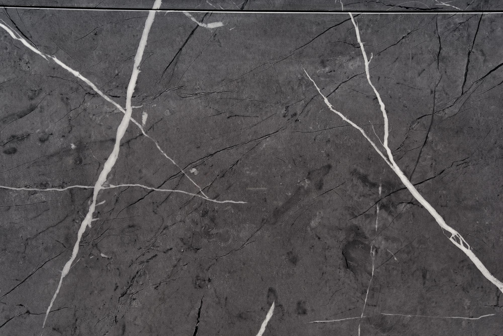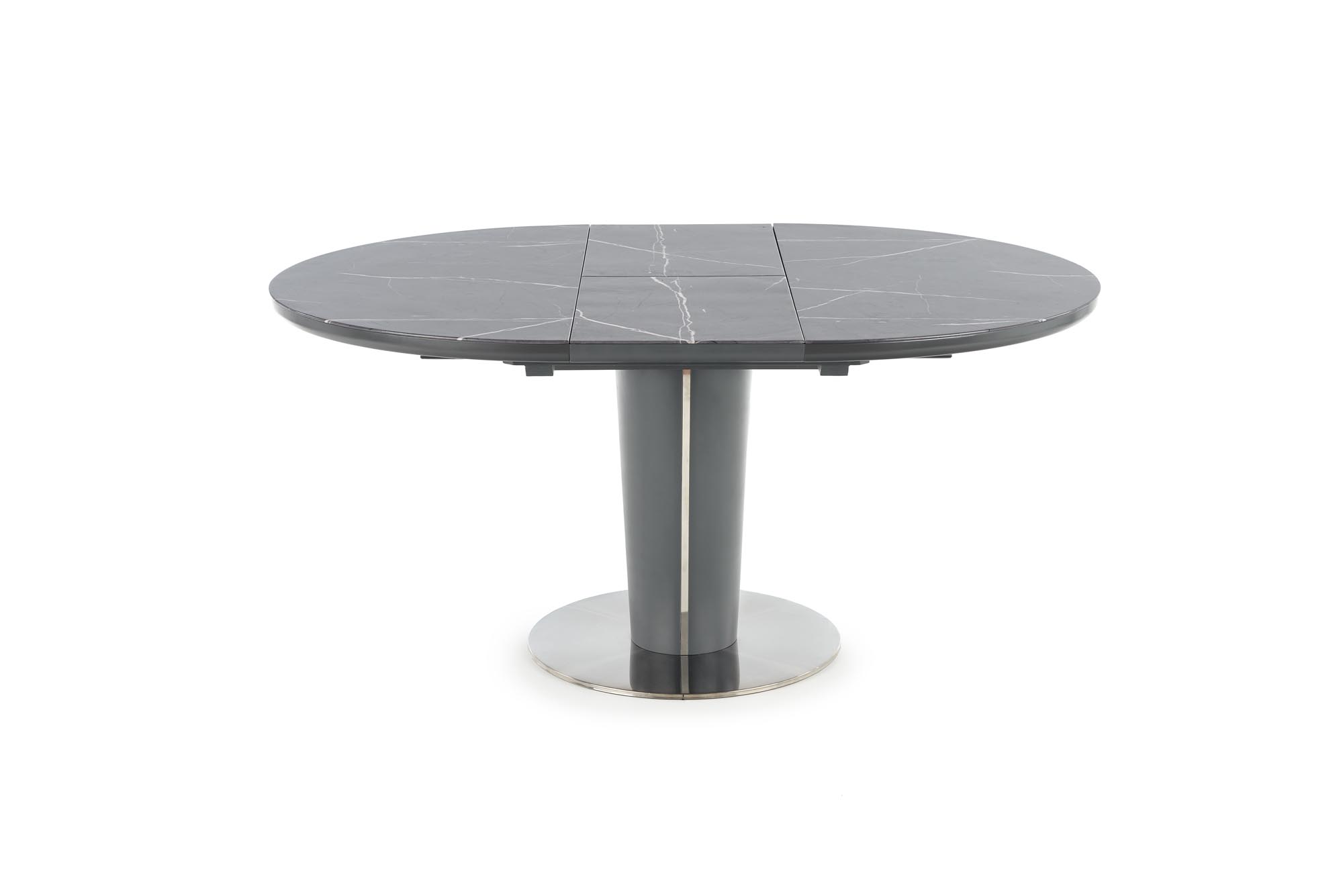 stół rozkładany, wymiary: 120-160/120/76 cm, materiał: szkło / MDF lakierowany / stal nierdzewna, kolor: blat – popielaty marmur, nogi – ciemny popiel