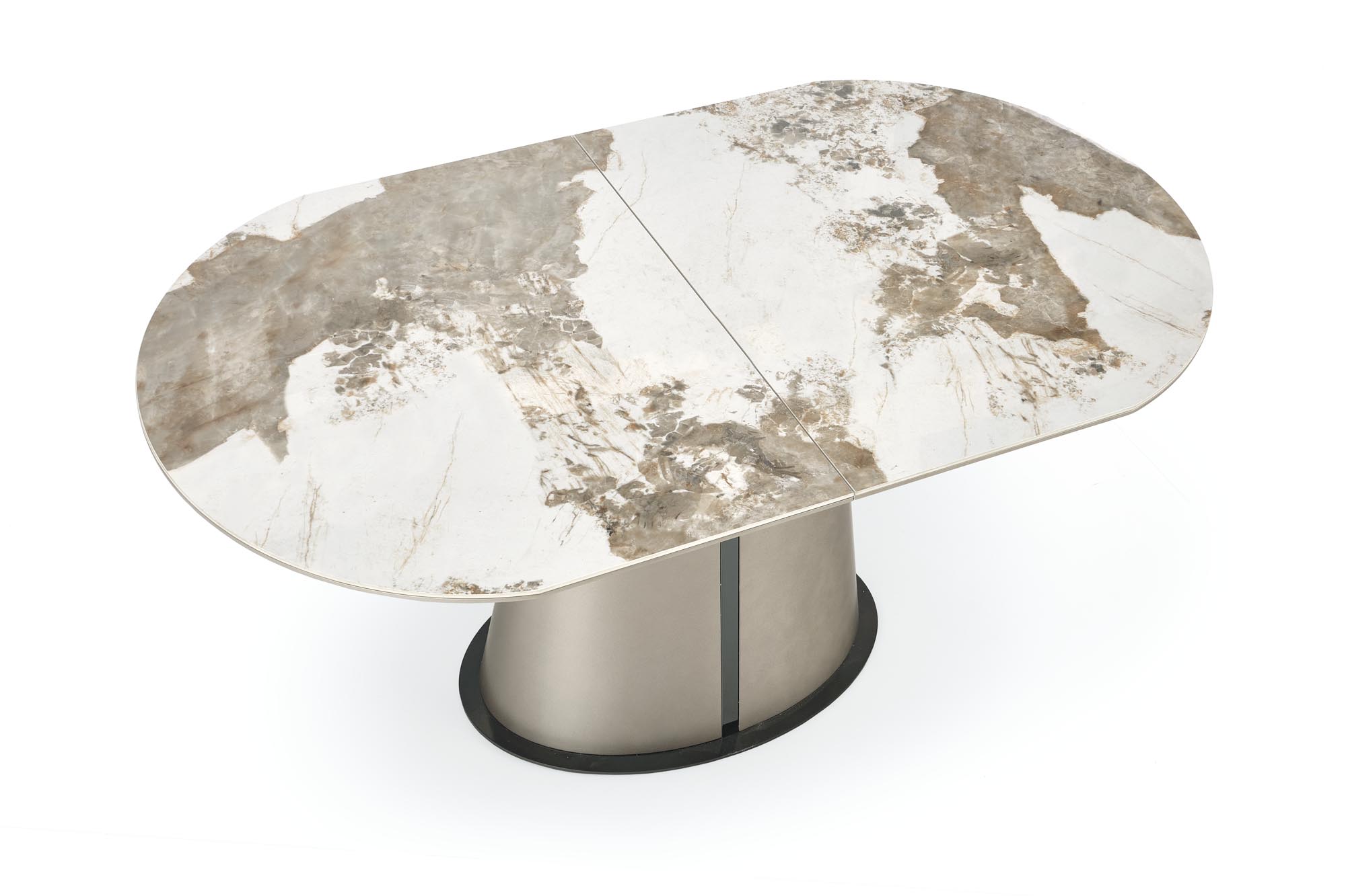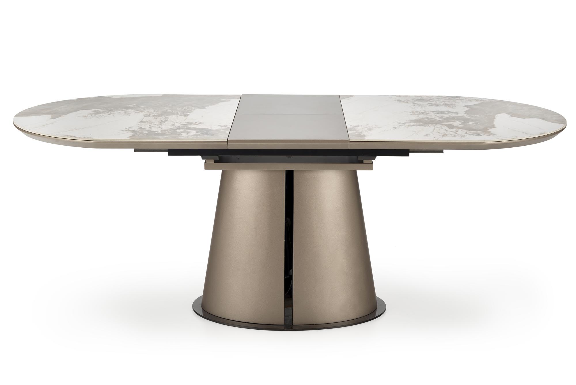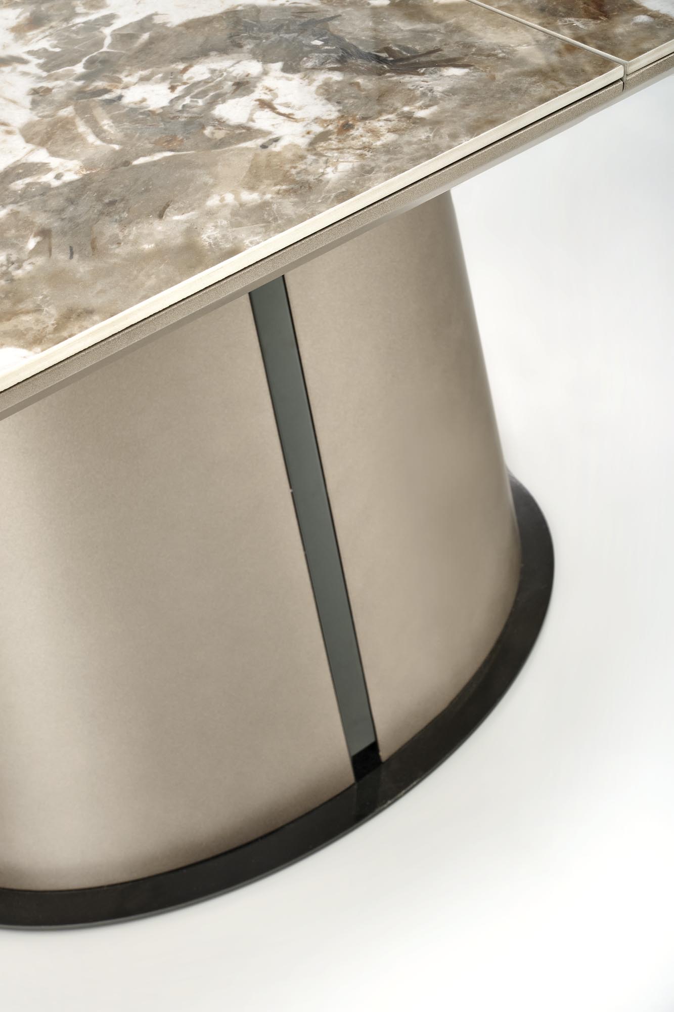 wymiary: 160-200/90/76 cm, stół rozkładany, materiał: ceramika / MDF lakierowany / stal malowana proszkowo, kolor: blat – beżowy marmur / cappuccino, noga – cappuccino – czarny
