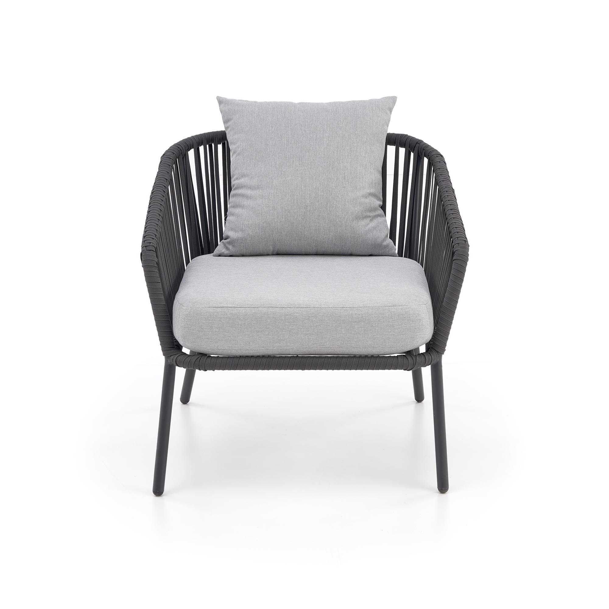 zestaw ogrodowy ( sofa + fotel 2x + ława ), wymiary: 155/71/70/43 cm (sofa), 71/71/70/43 cm (fotel), 99/59/37 cm (ława), materiał: aluminium malowane proszkowo / szkło / linka / tkanina, kolor: ciemny popiel – jasny popiel