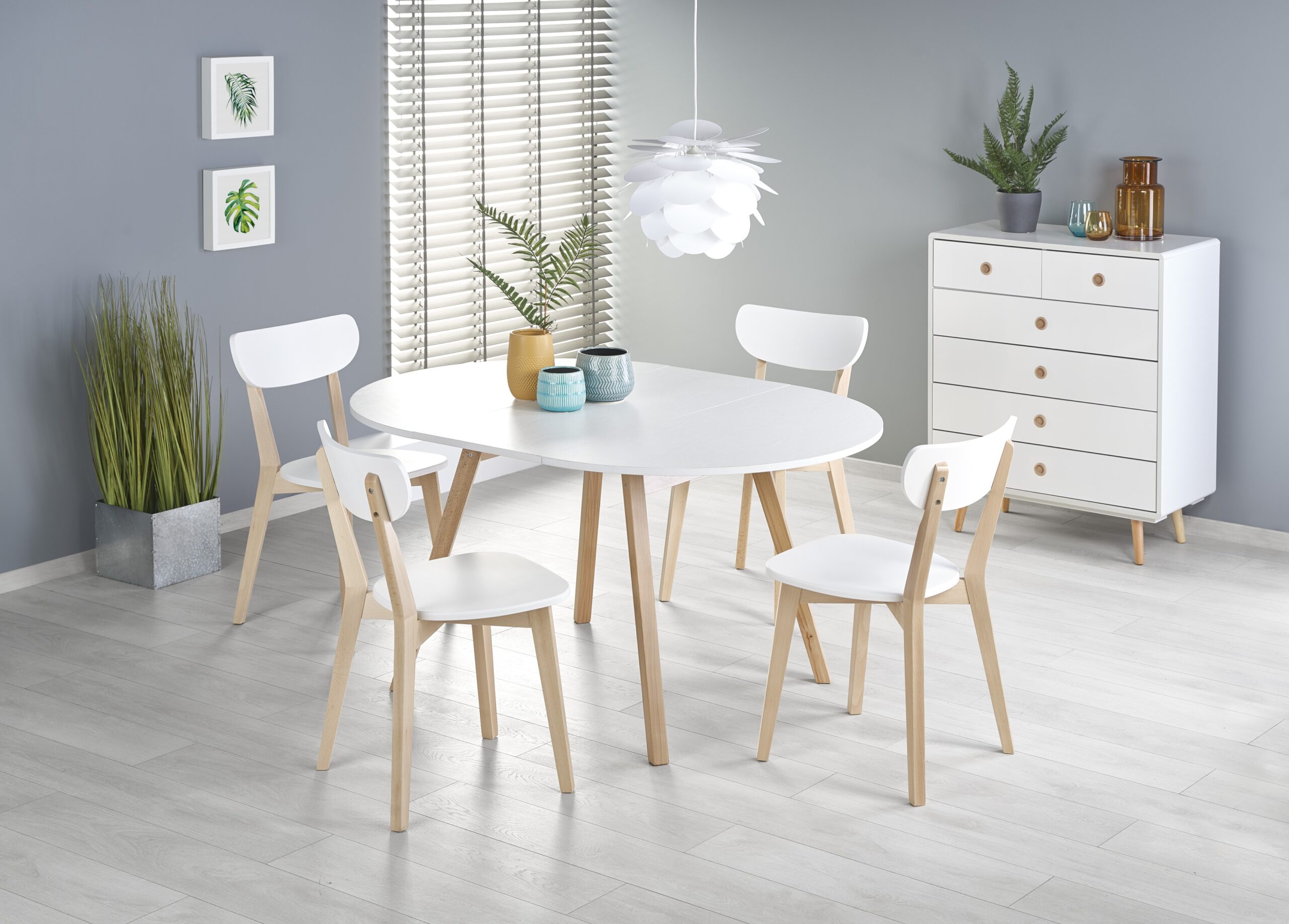 wymiary: 102-142/102/73 cm, stół rozkładany, materiał: MDF okleinowany / drewno lite – bukowe, kolor: blat – biały mat, nogi – dąb miodowy