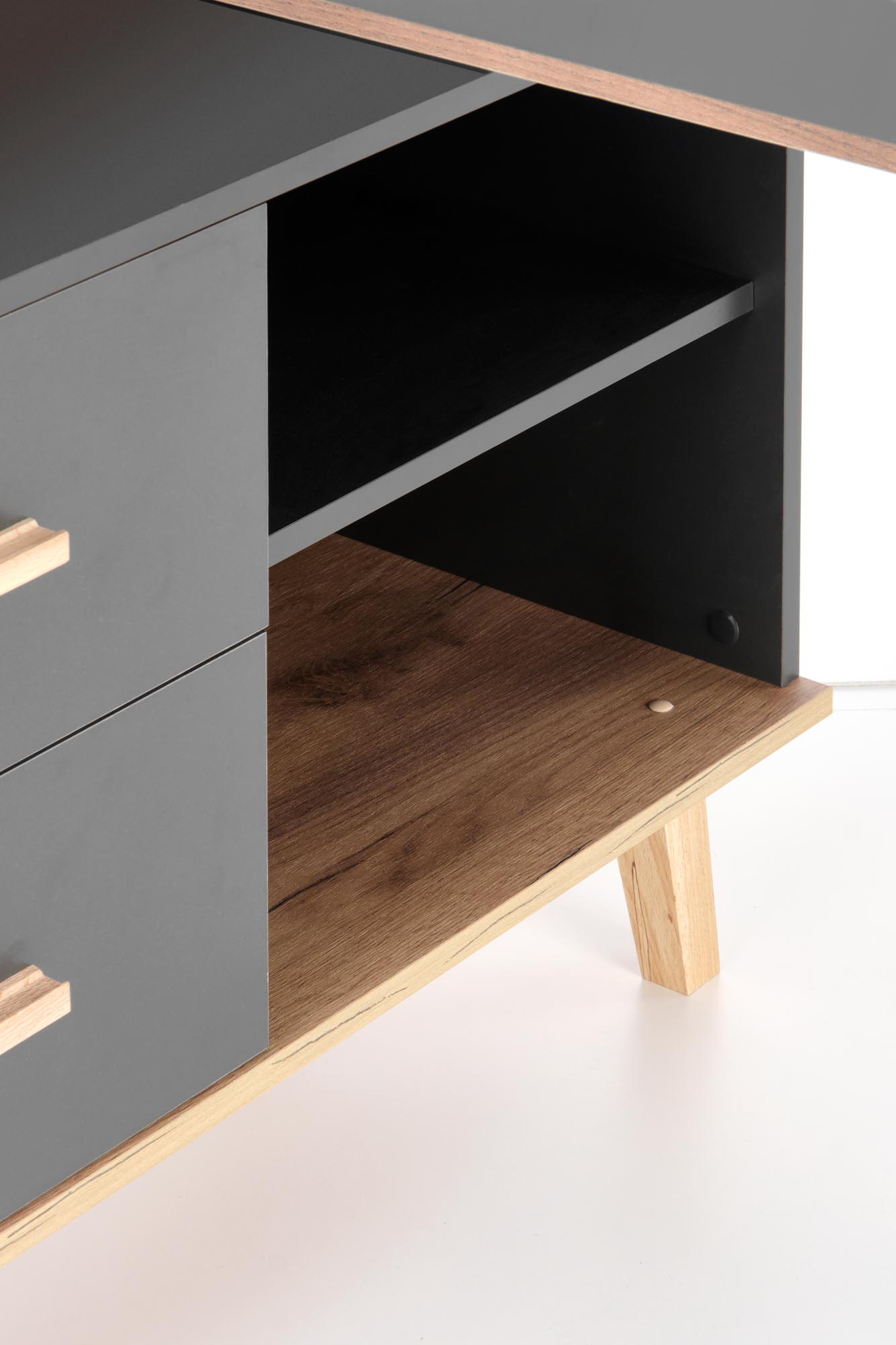 wymiary: 134-210/60-90/78 cm, biurko proste albo narożne, materiał: płyta meblowa okleinowana / MDF okleinowany / drewno lite, kolor: antracyt mat – dąb wotan