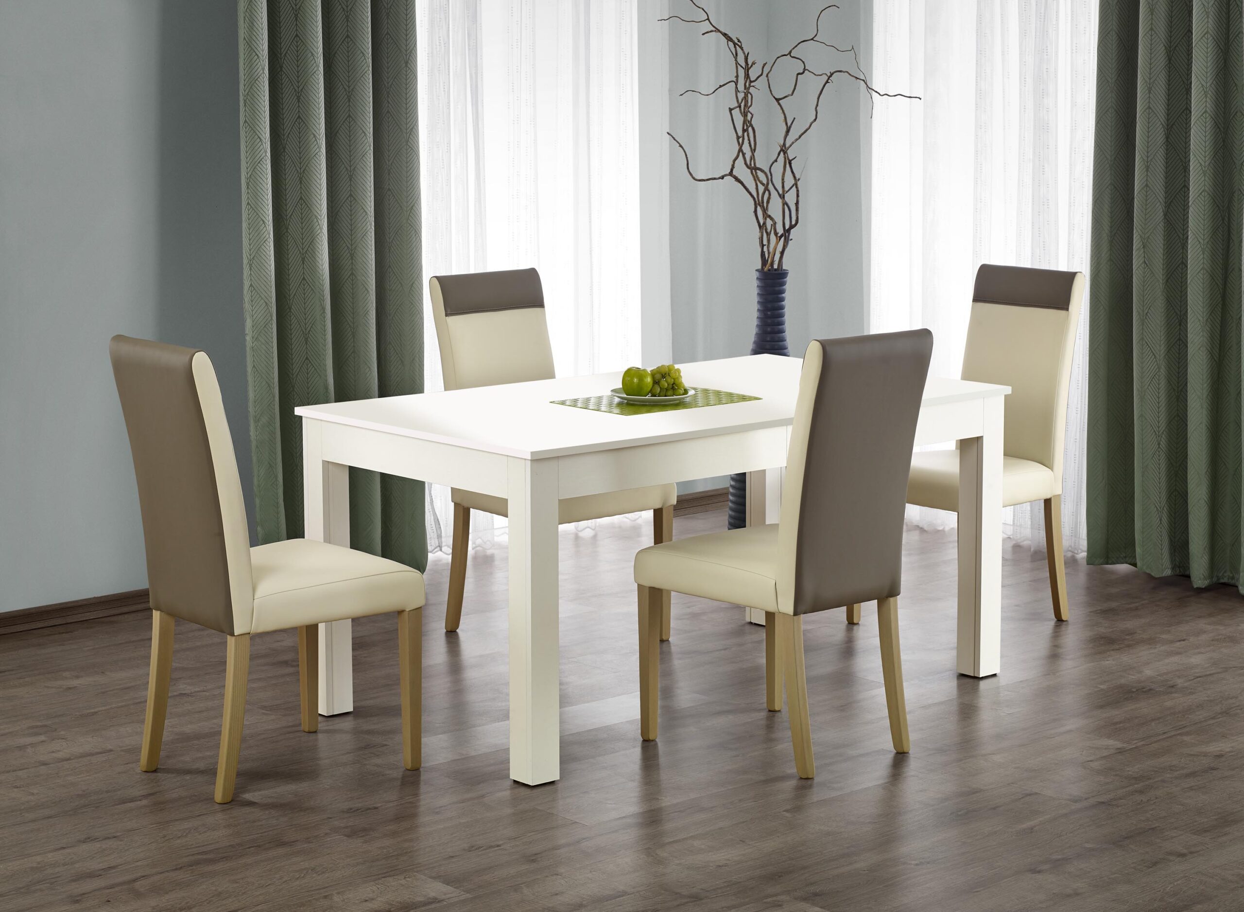 stół rozkładany, wymiary: 160÷300/90/76 cm, materiał: blat – płyta laminowana, na obrzeżach ABS, nogi – MDF laminowany, kolor: biały