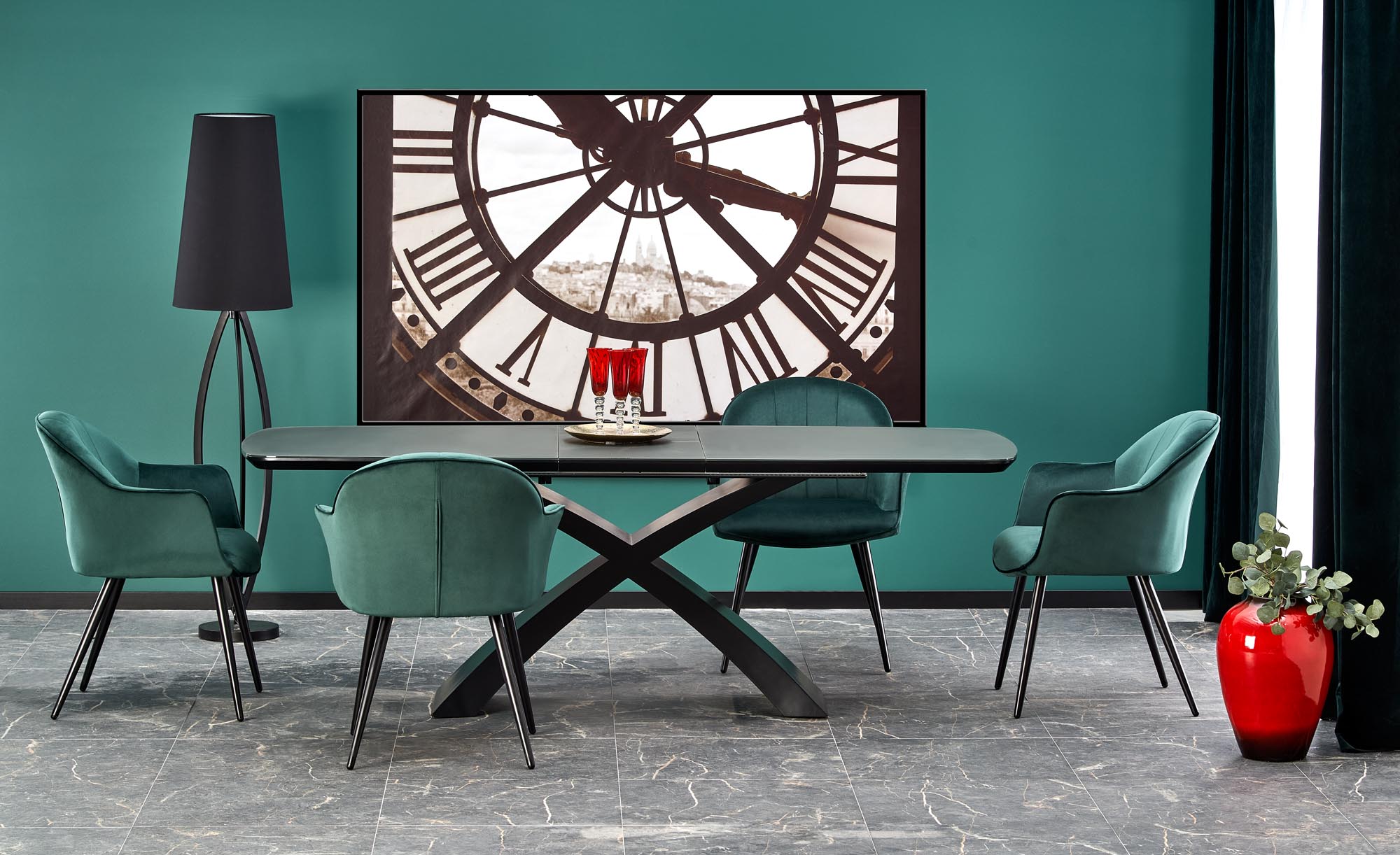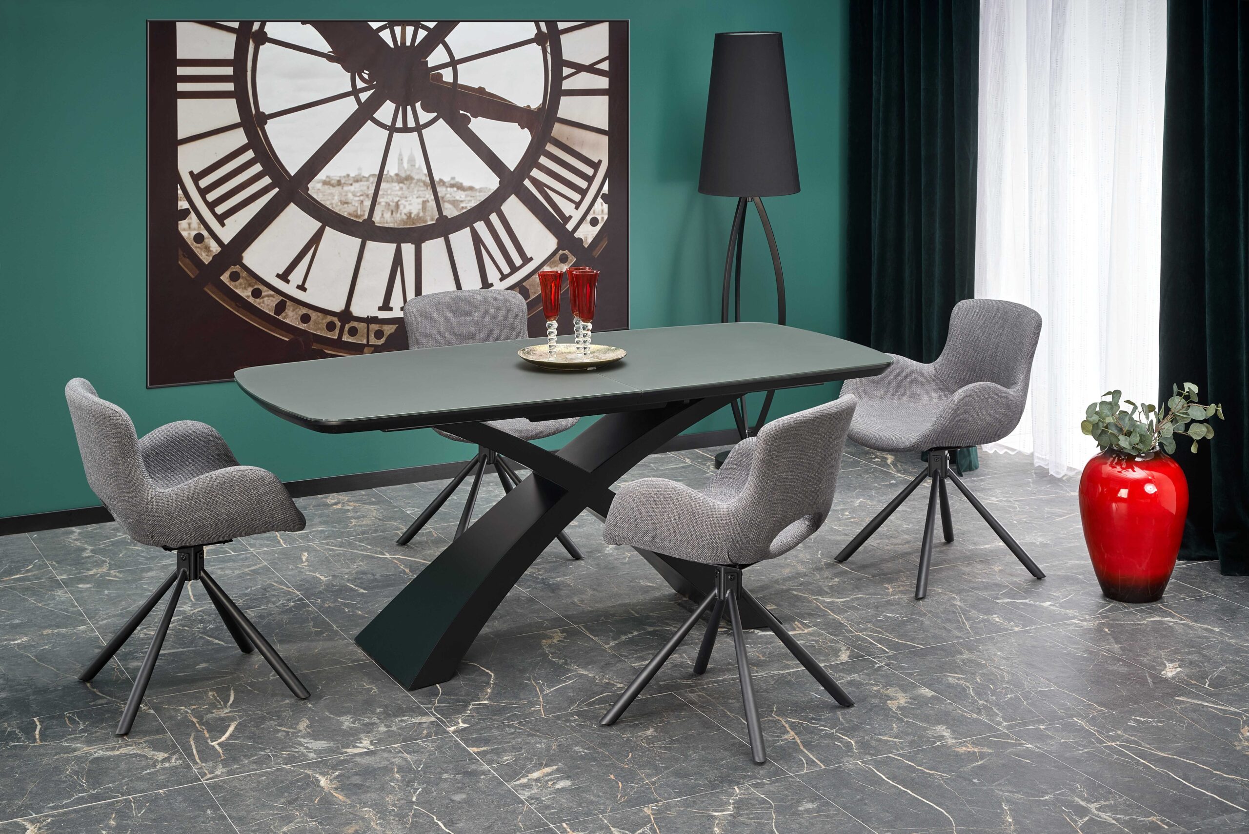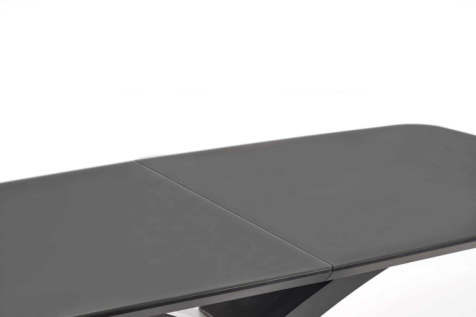 wymiary: 180-220/89/75 cm, stół rozkładany, materiał: szkło / MDF lakierowany, kolor: blat – ciemny popiel, noga – czarny