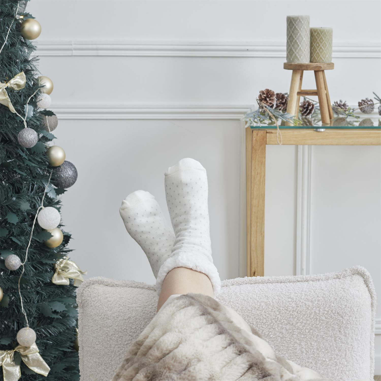 Ciepłe skarpety, wyściełane miękką, białą tkaniną sherpa to idealny prezent dla osoby, której nadwyraz szybko marzną nogi. Skarpety będa przydatne każdemu, komu zdaża się wrócić przemarźniętym. Dzięki ciepłej polietrowej tkaninie skarpety szybko ogrzewają stopy i dodają komfortu podczas odpoczynku.