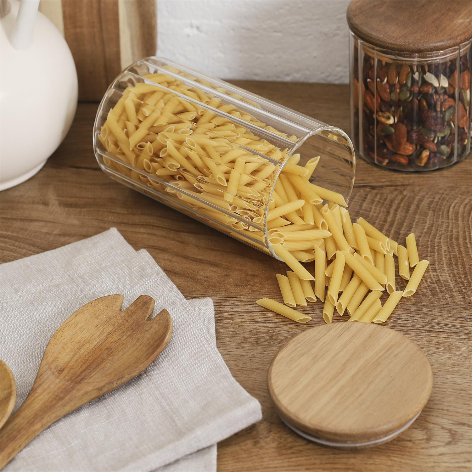 Słój do przechowywania wykonany został ze szkła o ciekawym ryflowanym kształcie. Słój wykończony został drewnianą pokrywką z drewna akacjowego. Silikonowa uszczelka, która została zamontowana na pokrywce gwarantuje szczelność i mocne zamknięcie słoja. Nie mozna myć w zmywarce, Nie można używać w piekarniku, Nie można używać w mikrofalówce. Nadaje si do kontaktu z żywnością