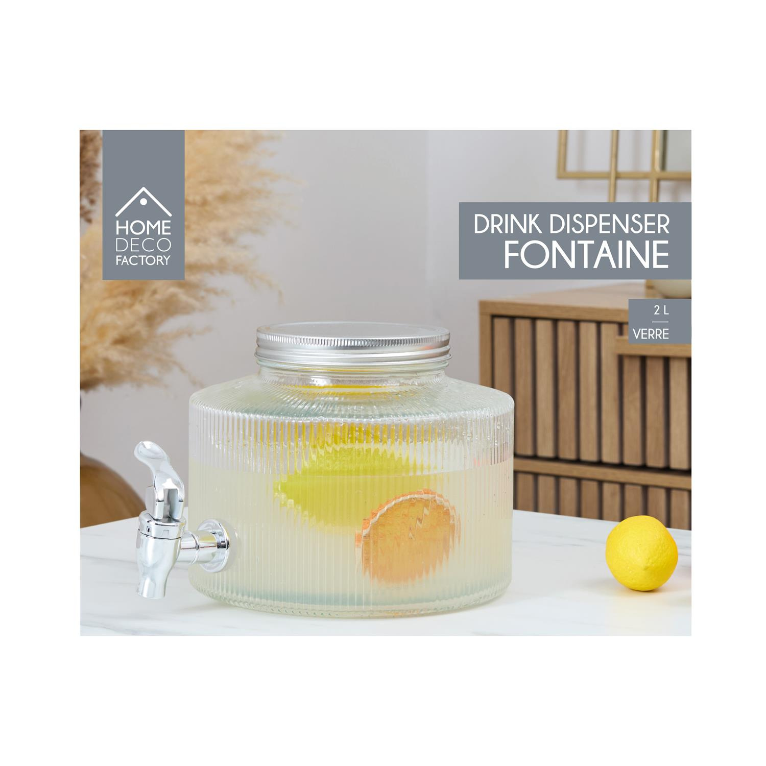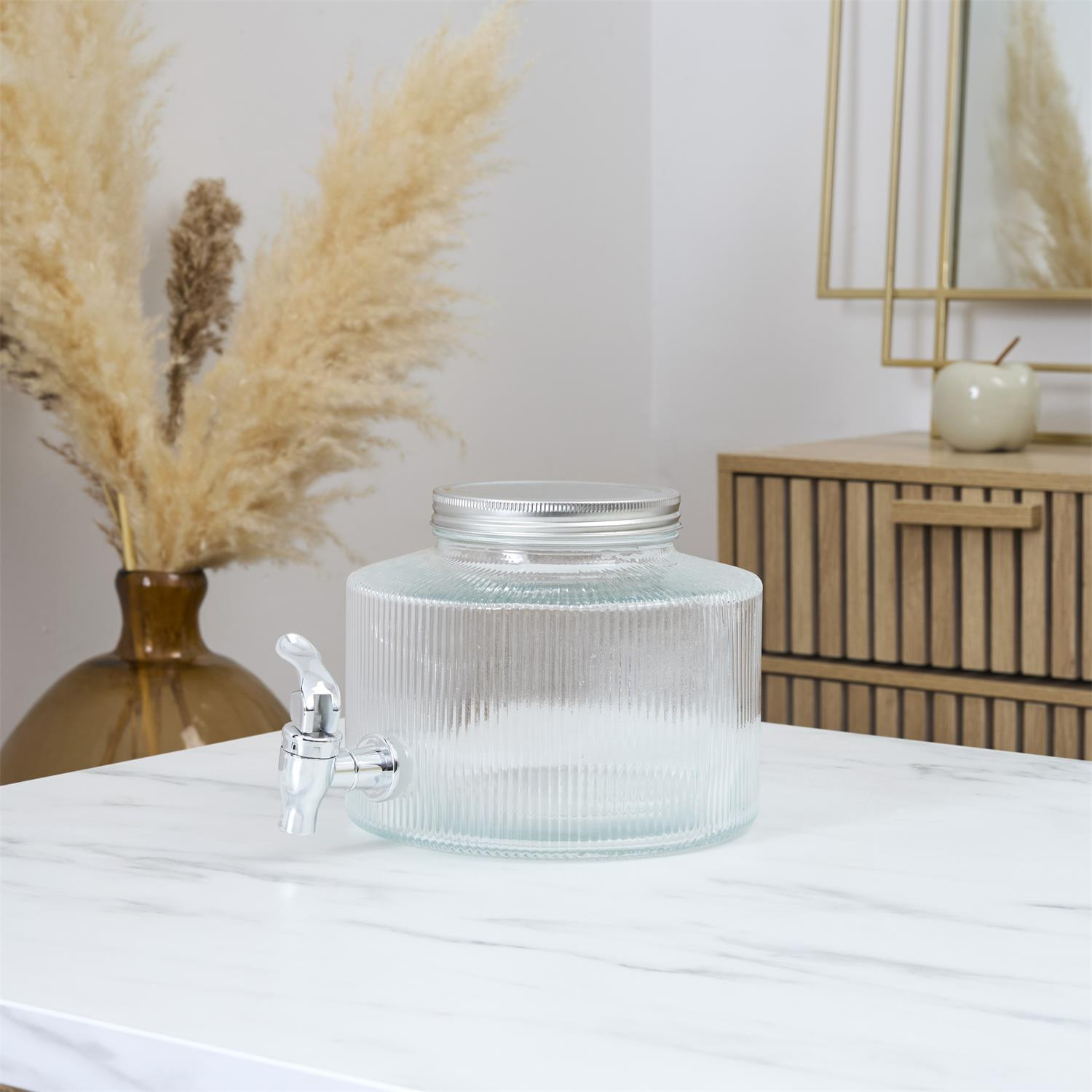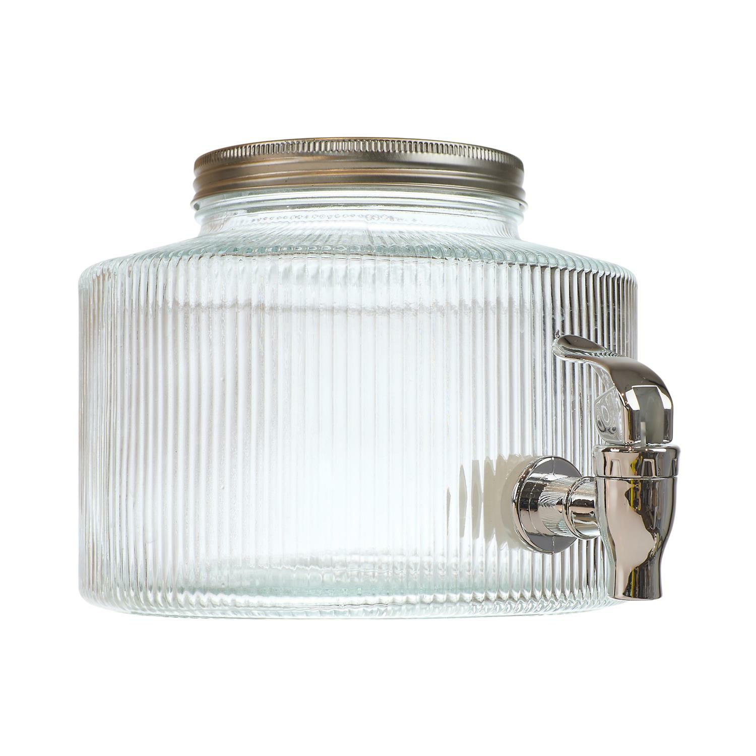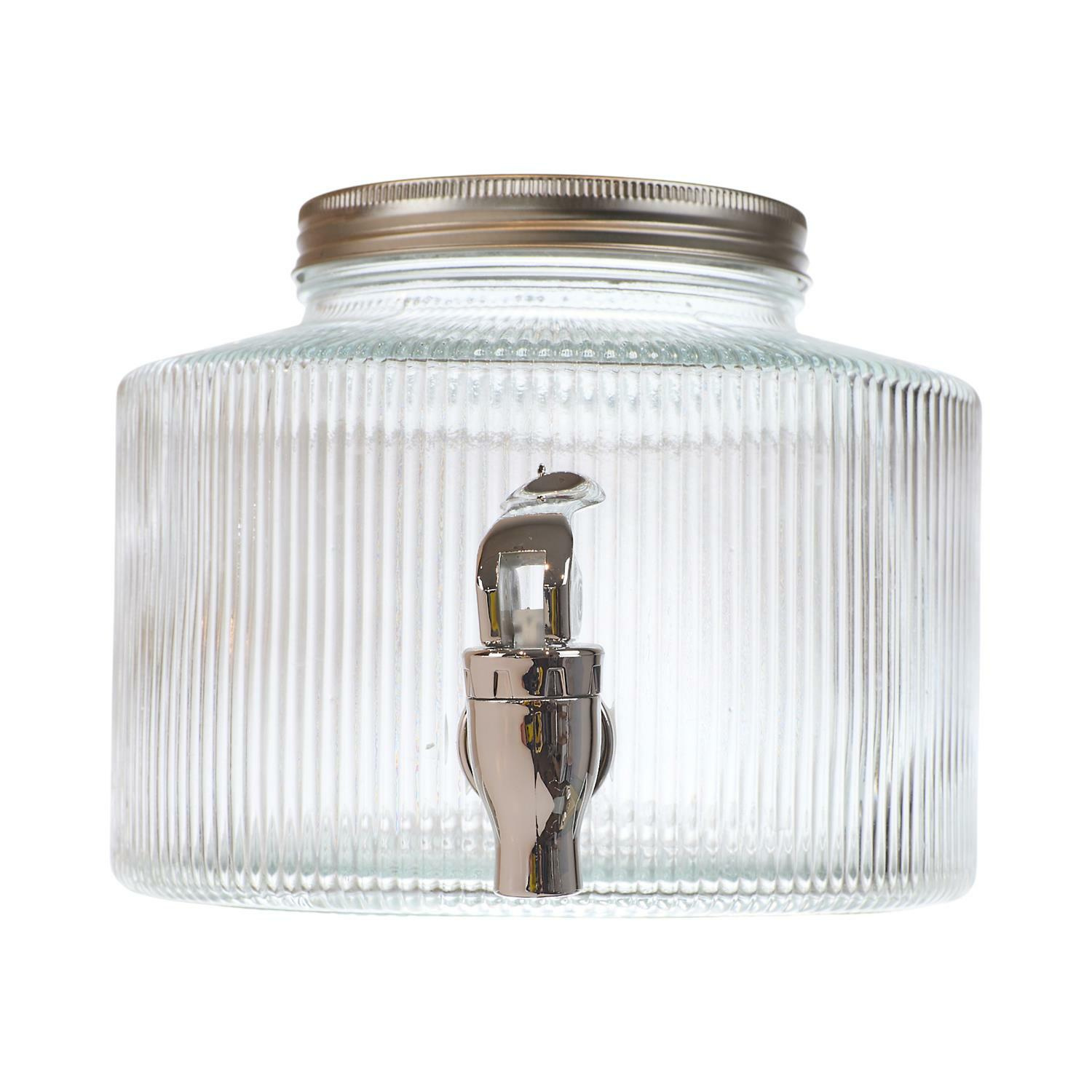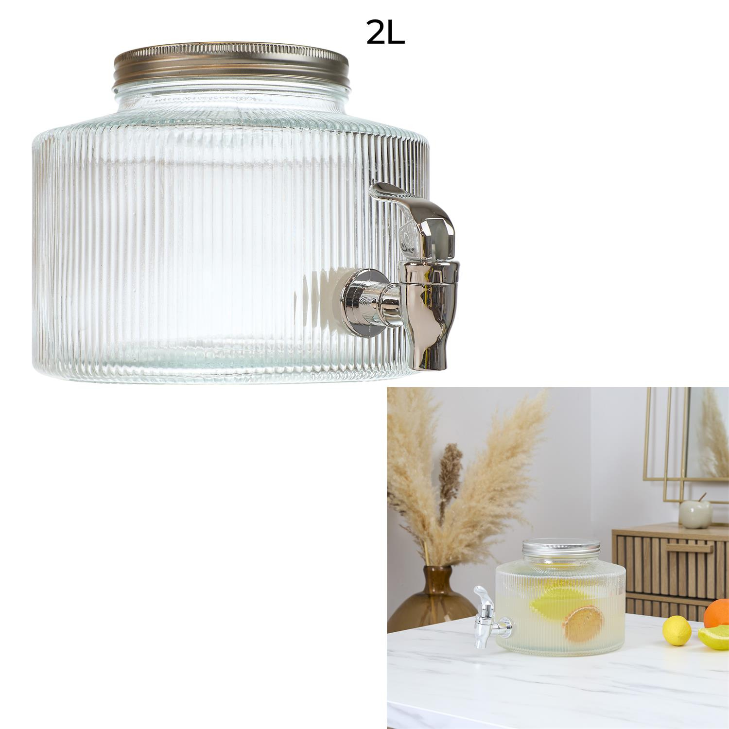Elegancki słój Colar to idealne połączenie funkcjonalności i nowoczesnego designu. Dzięki prążkowanej strukturze szkła oraz srebrnym wykończeniom, stanowi efektowny element dekoracyjny każdego wnętrza lub przyjęcia. Pojemność: 2 litry, co czyni go idealnym do serwowania lemoniady, mrożonej herbaty, soków lub wody z owocami. Wysoka jakość wykonania: Słój został wykonany z grubego, przezroczystego szkła o pionowym tłoczeniu, które pięknie rozprasza światło i eksponuje zawartość. Praktyczny kranik: Wyposażony w solidny kranik w kolorze srebrnym, który umożliwia wygodne i precyzyjne dozowanie napojów bez rozlewania. Materiał: szkło, metal i plastik