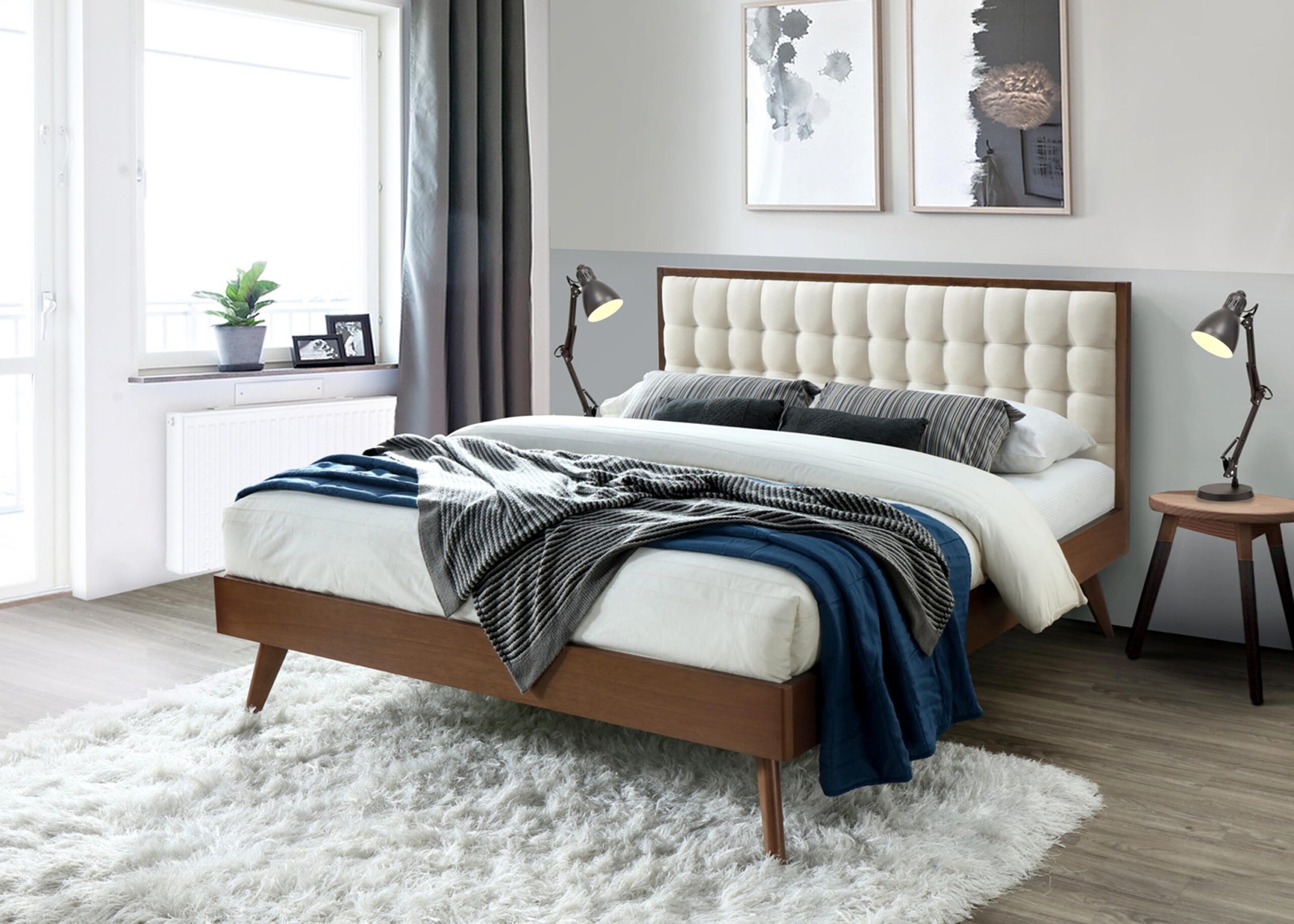 wymiary: 166/209/106 cm, materiał: tkanina / drewno lite – kauczukowe, kolor: beżowy – orzech, * łóżko bez materaca, w opcji materac POLARIS 160