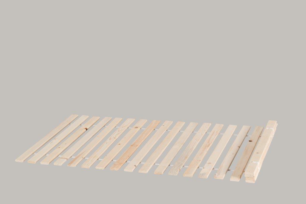 Stelaż wykonany całkowicie z drewna świerkowego. Listwy świerkowe 20 szt. o szerokości 65 mm umocowane na taśmie. Odległość między listwami 35 mm.