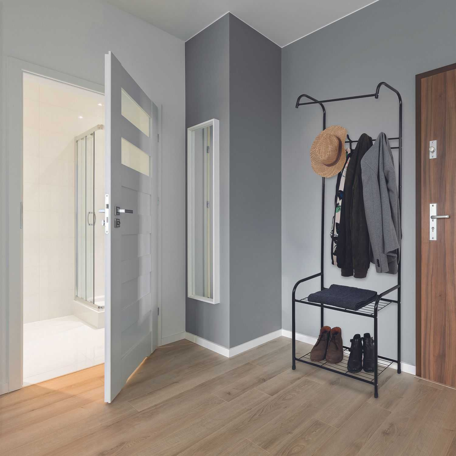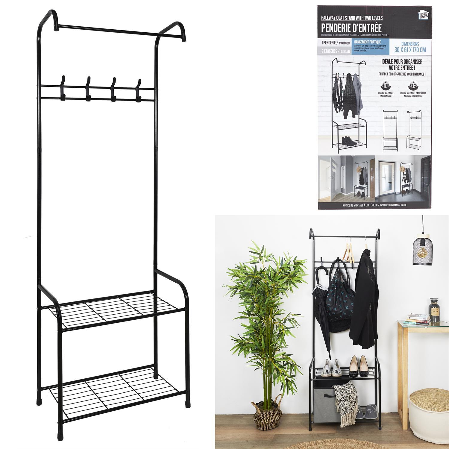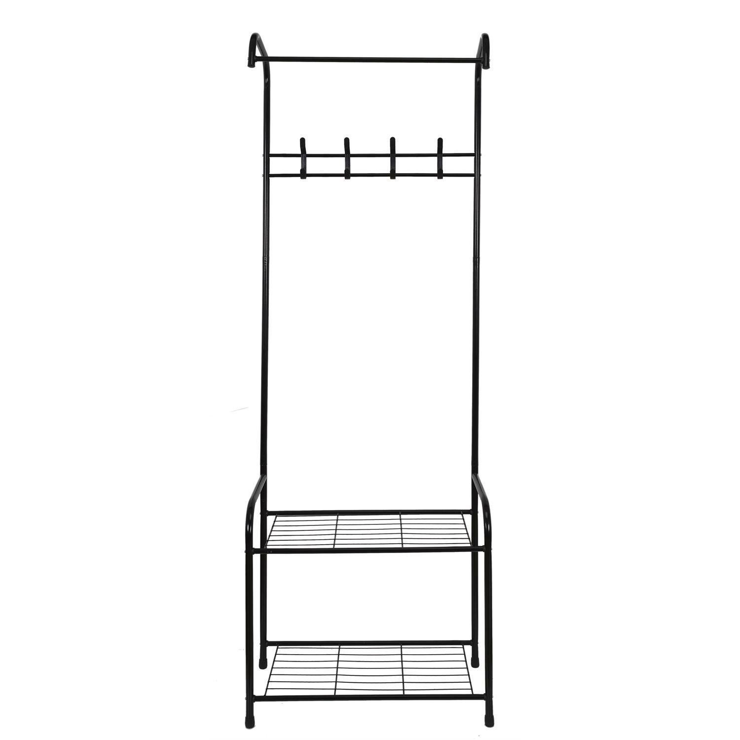 Wieszak do przedpokoju z metalu w kolorze czarnym pozwoli na szybką aranżację przedpokoju. Wieszak 2 w 1, gdyż posiada on wieszaki na kurtki oraz półki na buty. Dzięki temu meblowi możemy uporządkować buty oraz kurtki bez ingerencji w ściany mieszkania. Dzięki temu, że wieszaka nie trzeba mocować do ściany tak jak standardowe wieszaki, nadaje się on idealnie do mieszkania wynajmowanego. Ta niezwykle praktyczna szafa do przedpokoju ma 2 półki na buty i 4 haczyki na kurtki i płaszcze! – Skład: stal nierdzewna, tworzywo sztuczne. Wymiary opakowania: 64,00 x 7,50 x 36,50 cm