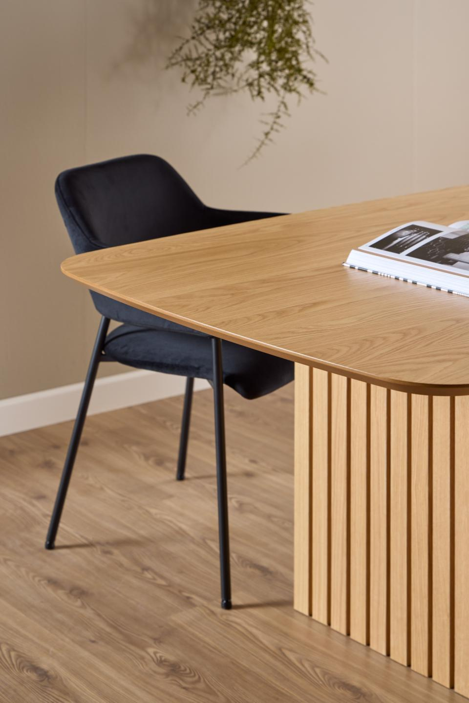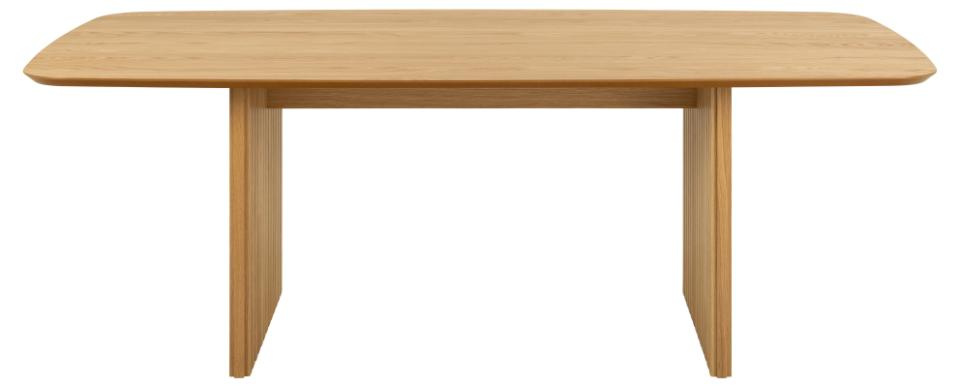 Z tym stołem jadalnym w swojej jadalni stworzysz atmosferę sprzyjającą rozkoszowaniu się posiłkiem. Przestronny, prostokątny blat, ozdobiony lakierowanym fornirem dębowym, tworzy ciepłą atmosferę, podobnie jak podstawa z lamelowymi frontami. Ten stół jest idealny dla każdego, kto ceni sobie nordycki design mebli.