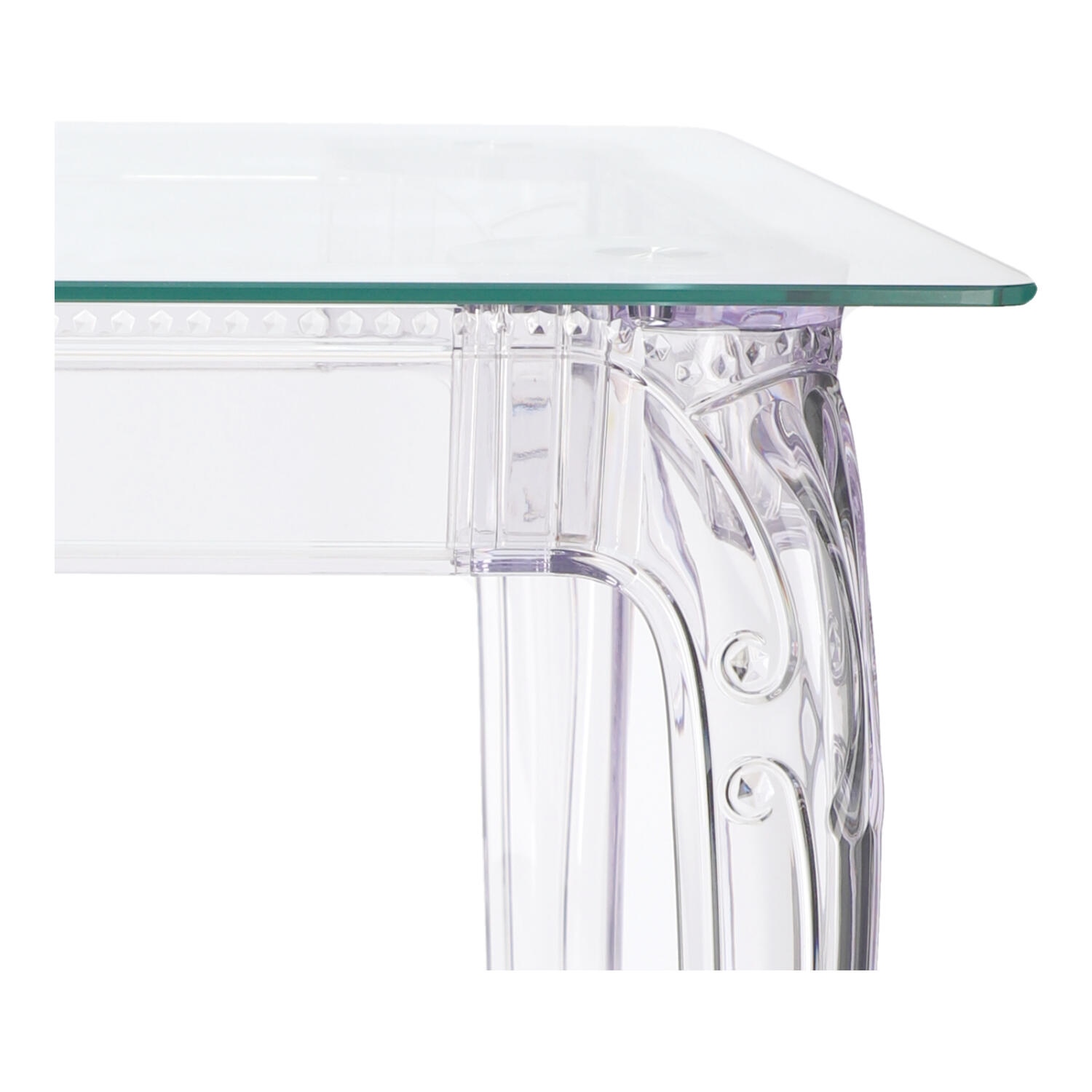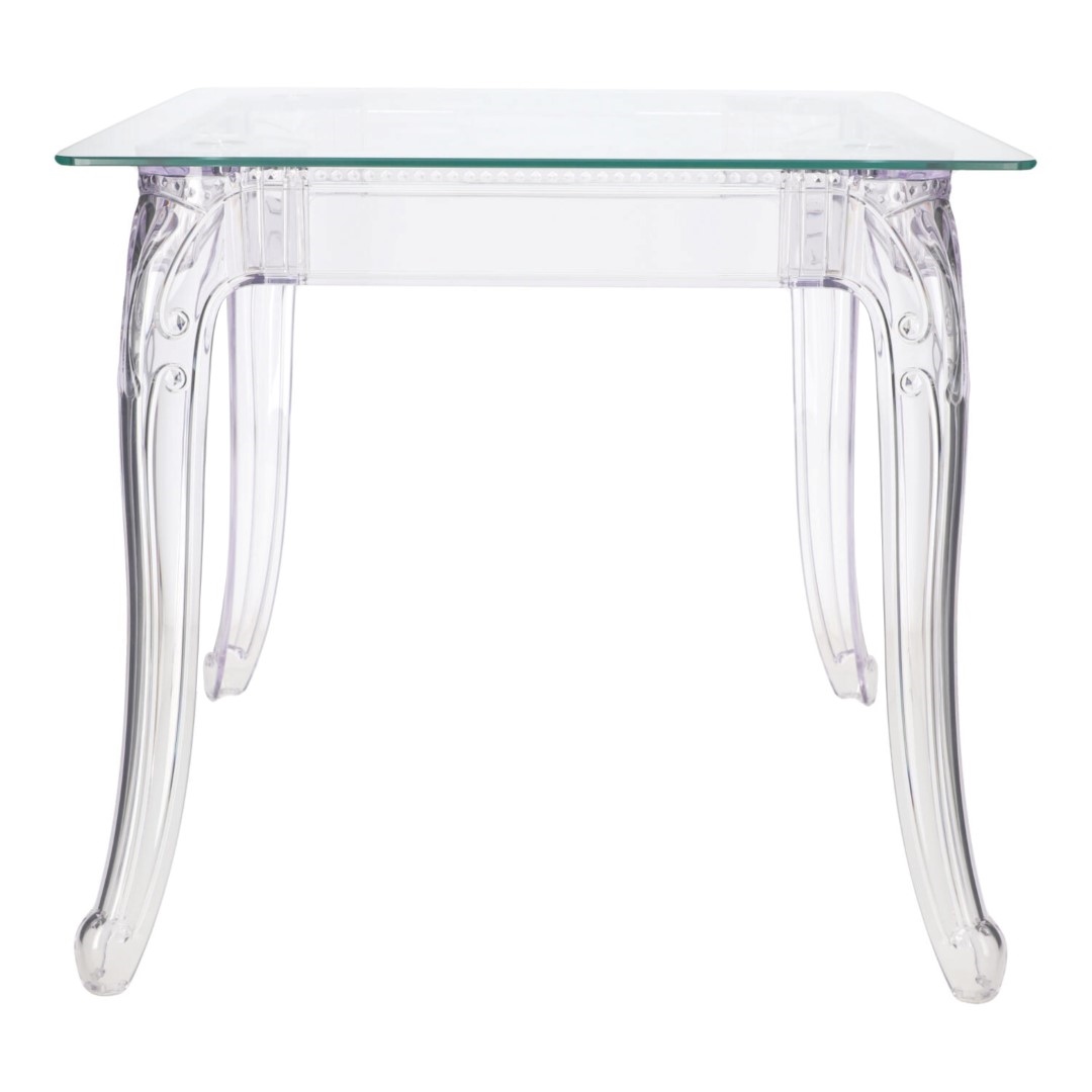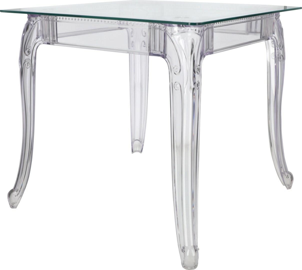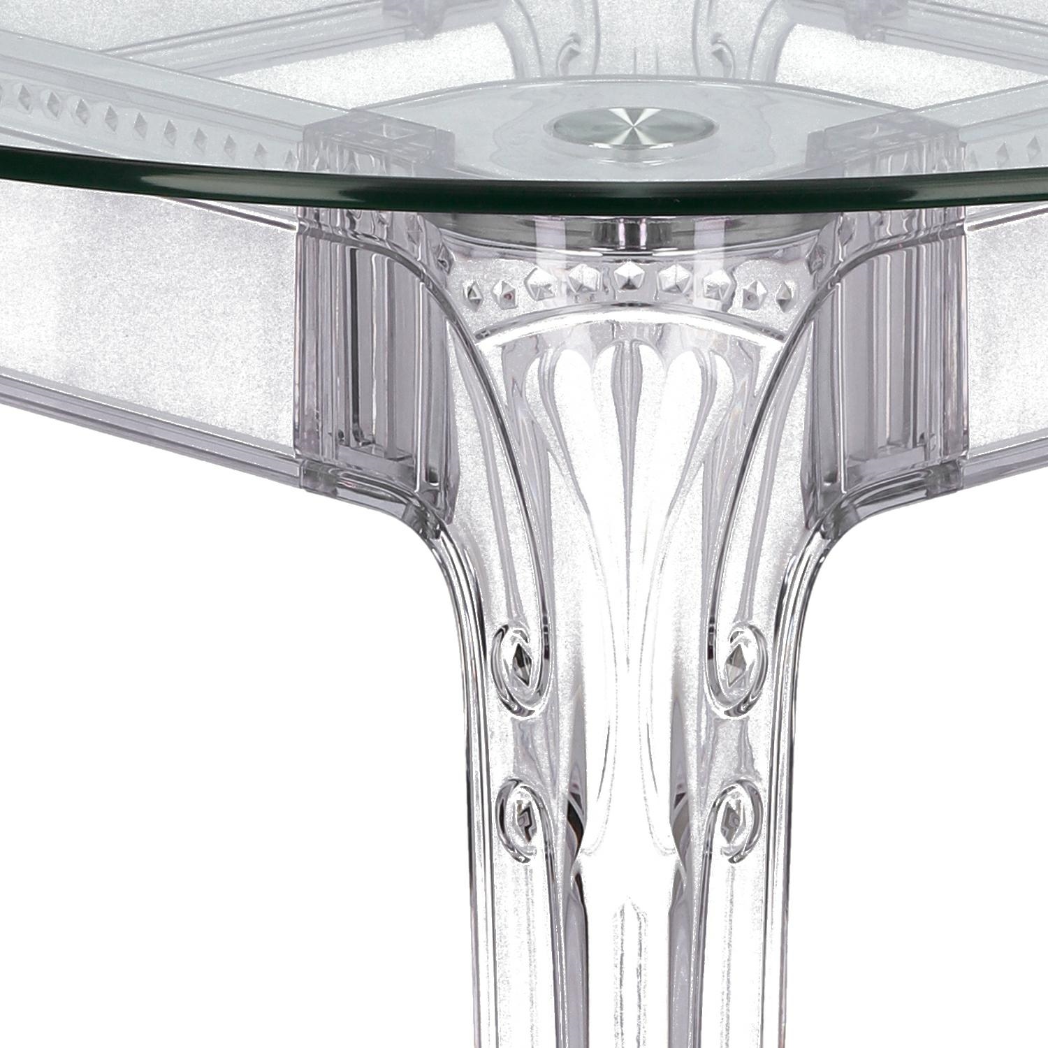 Stół Ghost to połacznie klasycznej wręcz barokowej formy oraz nowoczesnej techniki, oraz wytrzymałych materiałów. Stół Ghost posiada szklany blat o grubości 10 mm, który podpierają bogato zdobione poliwęglanowe nogi. Poliwęglan to bardzo wytrzymałe tworzywo o szerokim zastosowaniu. Dzięki temu, że nogi stołu zostały zrobione ze sztucznego tworzywa, są one odporne na uszkodzenia mechaniczne czy zadrapania i wilgoć. Ghost to doskonały stół do małej jadalni, kuchni lub salonu. Przezroczysta forma mebla sprawia, iż nie przytłacza on pomieszczenia, a wręcz odbija światło i wnętrze wydaje się większe. Grubość blatu: 10 mm Grubość nóg: od 5 do 8,5 cm Wymiary kartonu: 80x20x22 cm