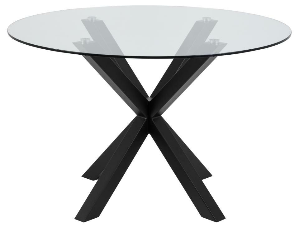 Okrągły stół do jadalni Heaven, blat z przezroczystego szkła hartowanego, podstawa krzyżowa z matowej, szorstkiej stali malowanej proszkowo na kolor czarny. Ten okrągły stół jadalniany zapewnia miejsce do delektowania się swobodnymi posiłkami i pogawędkami przy kawie, nawet w niewielkich jadalniach i kącikach kuchennych. Blat z przezroczystego szkła hartowanego osadzony jest na rzeźbiarskiej podstawie z czarnej, szorstkiej stali malowanej proszkowo, nadającej mu architektoniczny wygląd. Waga 39kg, Max obciążenie 100kg. Wymaga montażu. Wymiary kartonów: 127,5×127,5x5cm i 76x73x7cm
