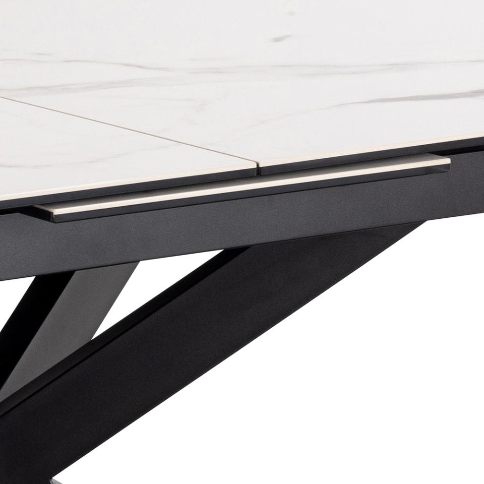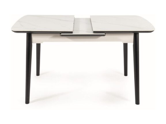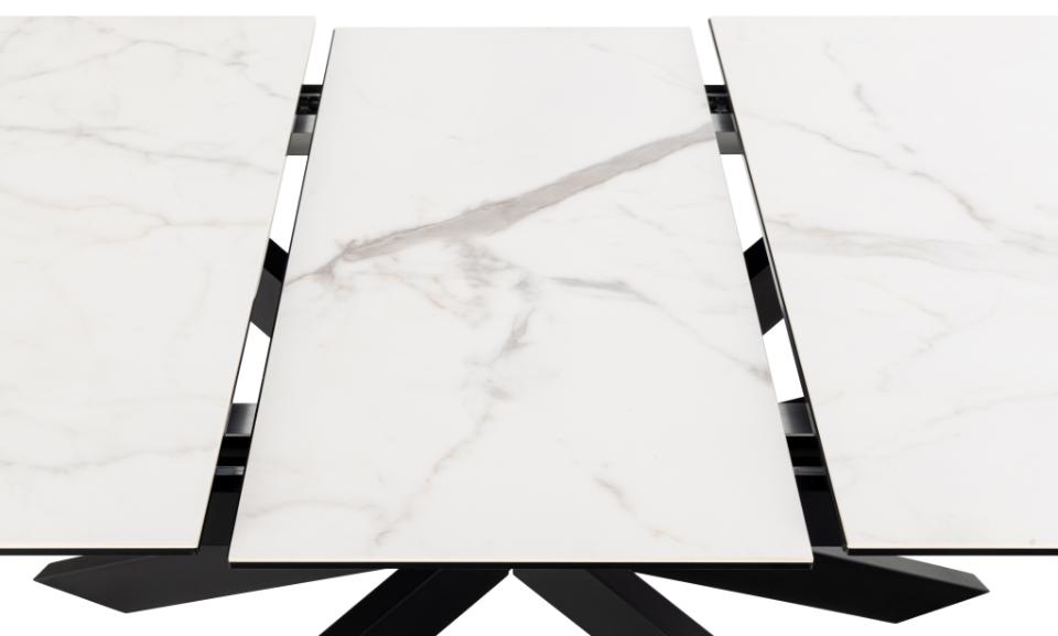 Wyposażony w biały ceramiczny blat, powierzchnia tego stołu wygląda dobrze, jest odporna na ciepło i zarysowania i może być łatwo przedłużona dzięki synchronicznemu dodatkowemu blatu. Wystarczy delikatnie pociągnąć za koniec stołu, a dodatkowy blat wysunie się i pojawi się na środku. Całość dopełnia czarna podstawa ze stali. Ciekawa budowa podstawy, która nadaje całości ponadczasowy efekt. Wyrazisty stół do jadalni z białym blatem. Odporna na ciepło i zarysowania ceramika na blacie. Synchronicznie wysuwane skrzydło z dopasowanej białej ceramiki . Podstawa krzyżowa wykonana z czarnej stali malowanej proszkowo dla uzyskania spektakularnego efektu. Wygodne miejsce dla 6 osób przed rozłożeniem i 8 osób po rozłożeniu. Wysokość pod blatem: 65,2cm. Wymiary kartonów: 72×67,5×12,5cm i 67,5x90x9cm Waga: 79 i 16,3 kg