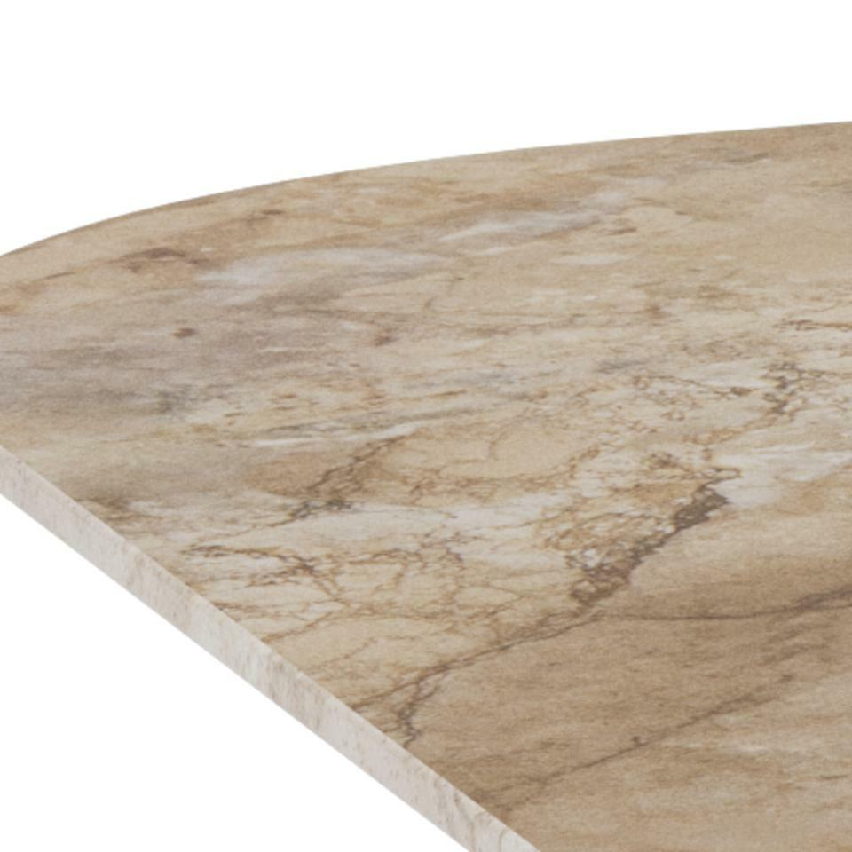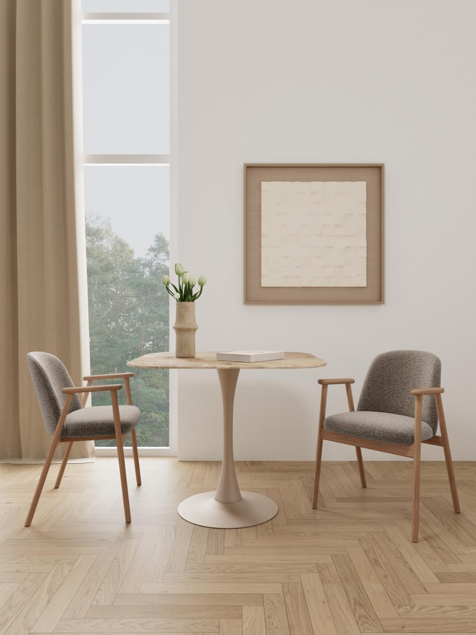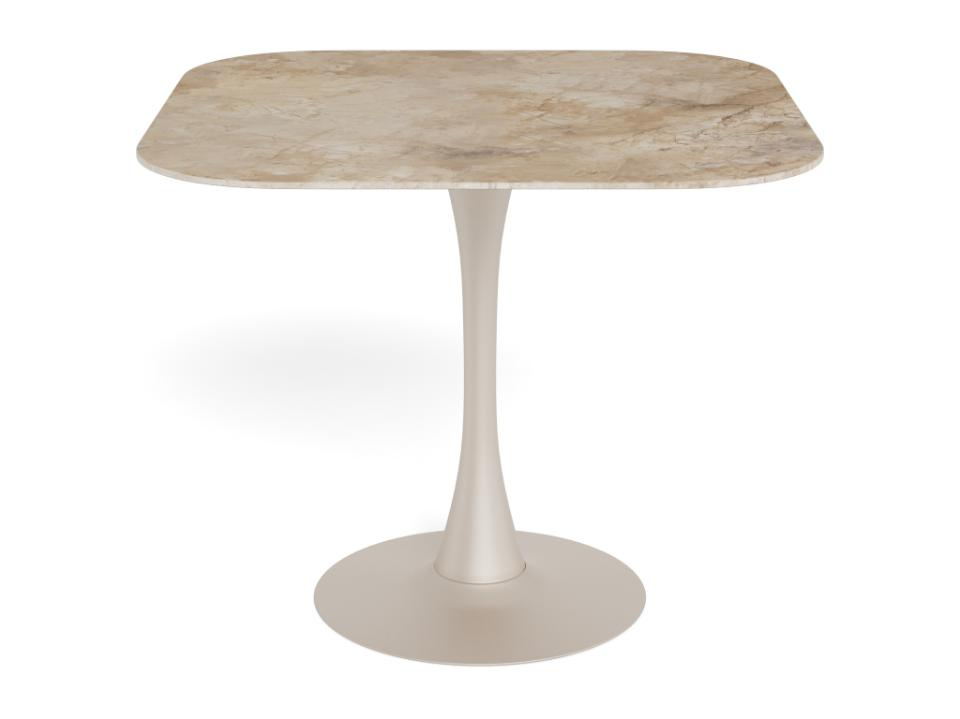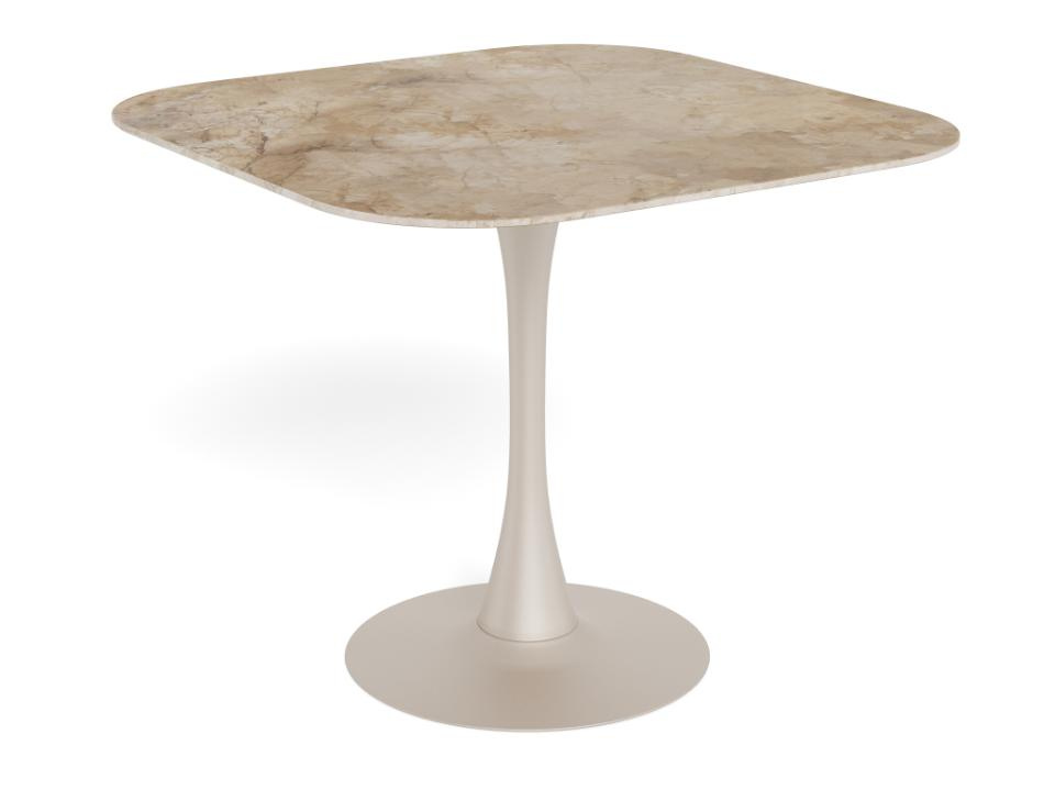 Ten kwadratowy stół jadalny z zaokrąglonymi narożnikami podtrzyma rozmowę. Dzięki okrągłej podstawie, brązowo-szary stół ma lekki i unoszący się w powietrzu wygląd. Ale to nie tylko styl – ceramiczny blat jest również praktyczny. Ceramika to materiał odporny na ciepło i zarysowania, wymagający niewielkiej konserwacji. Oszałamiający i praktyczny – dokładnie taki, jaki być powinien.