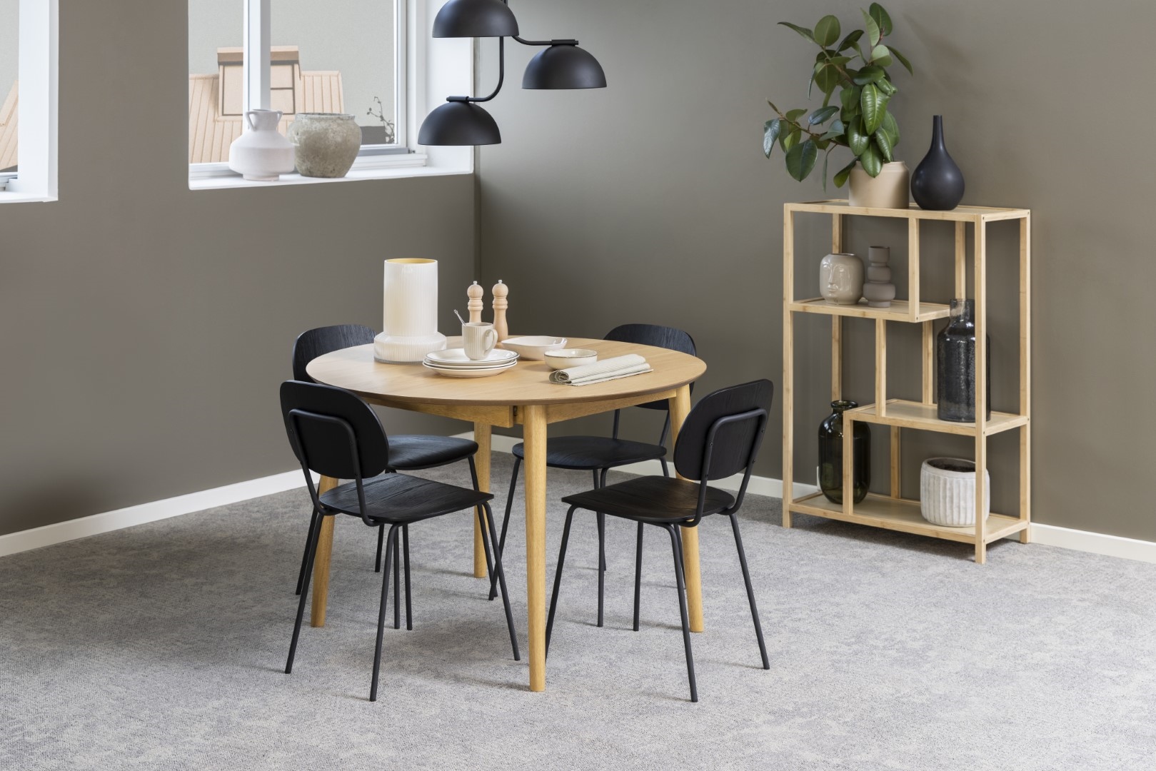 Stół Montreux jest w całości wykonany z drewna. Ma duży, okrągły blat pokryty fornirem w kolorze dębu. Podstawa wykonana jest z drewna kauczukowego pobejcowanego na kolor dopasowany do blatu. Blat jest rozsuwany, pod blatem głównym znajdują się blaty powiększającde stół do szerokości 154cm. Ilość kartonów: 1 Wymiary kartonów: 122,5×118,7x13cm Waga kartonów: 35kg
