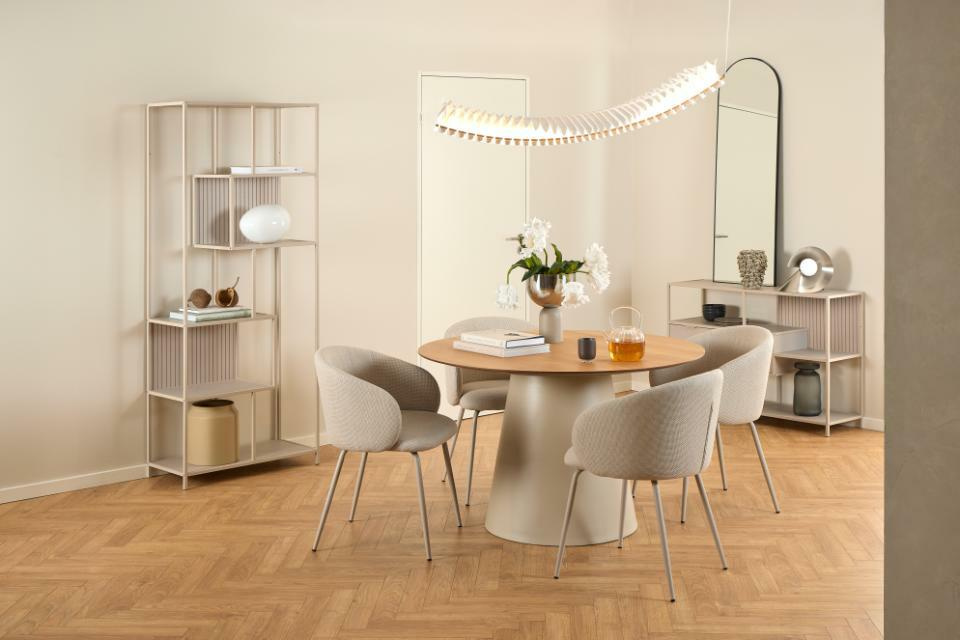 Ten okrągły stół jadalny, który swoją obecnością wypełnia przestrzeń, z łatwością tworzy przyjazną atmosferę dzięki swoim organicznym, zaokrąglonym kształtom. Połączenie szarej, stalowej podstawy z blatem z lakierowanego, fornirowanego dębu działa kojąco i pokazuje, że nawet materiał taki jak stal może być ciepły i przytulny w domowym wnętrzu. To atrakcyjny design do każdej jadalni.