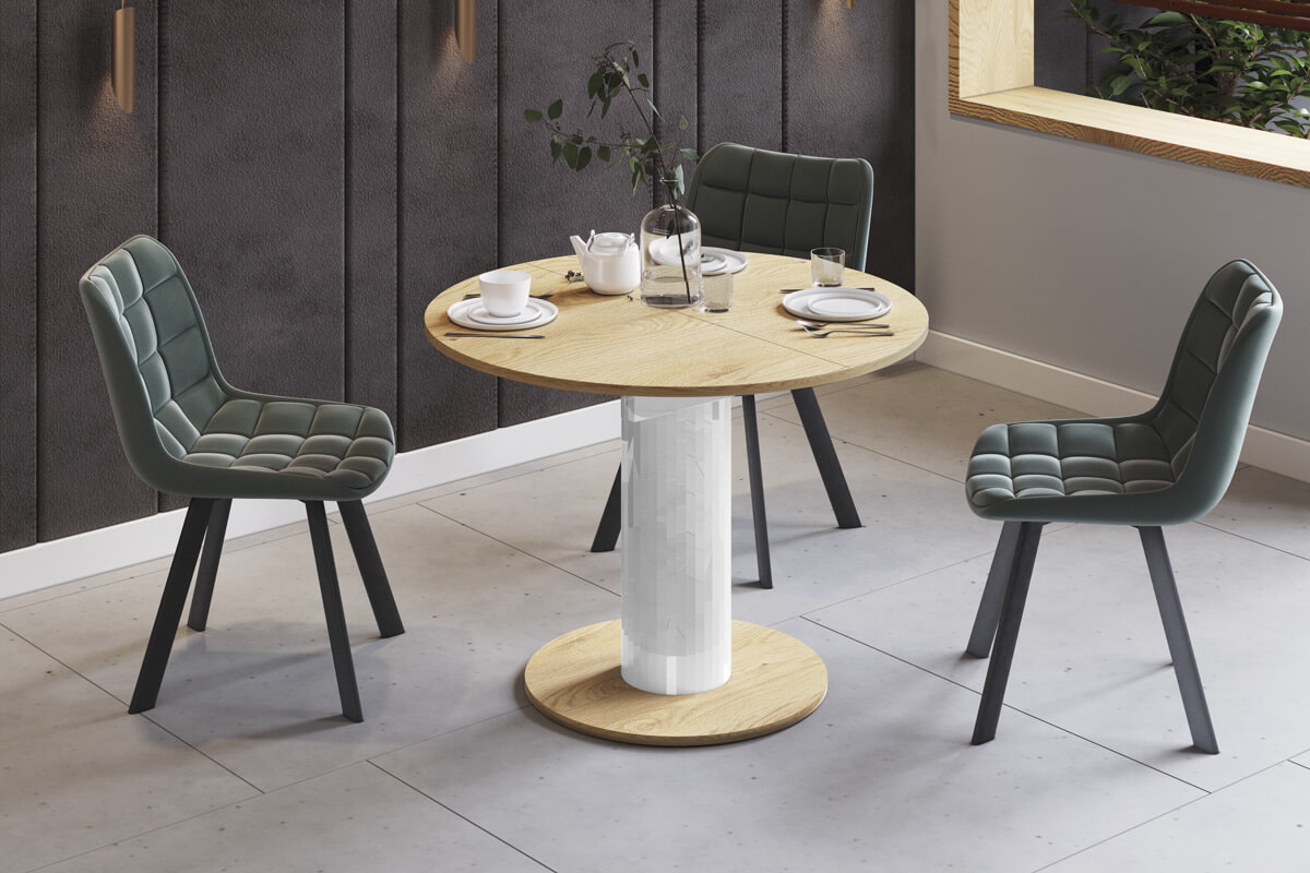 Stół rozkładany SOLO LUX charakteryzuje się prostotą, jakością wykonania i wymiarami idealnymi dla mniejszych i większych pomieszczeń. Okrągły kształt blatu oraz charakterystyczna ośmiokątna noga to wyraz nowoczesnego minimalizmu. Wspaniale łączy w sobie geometrię i harmonię odpowiadając najnowszym trendom w wyposażaniu wnętrz.
