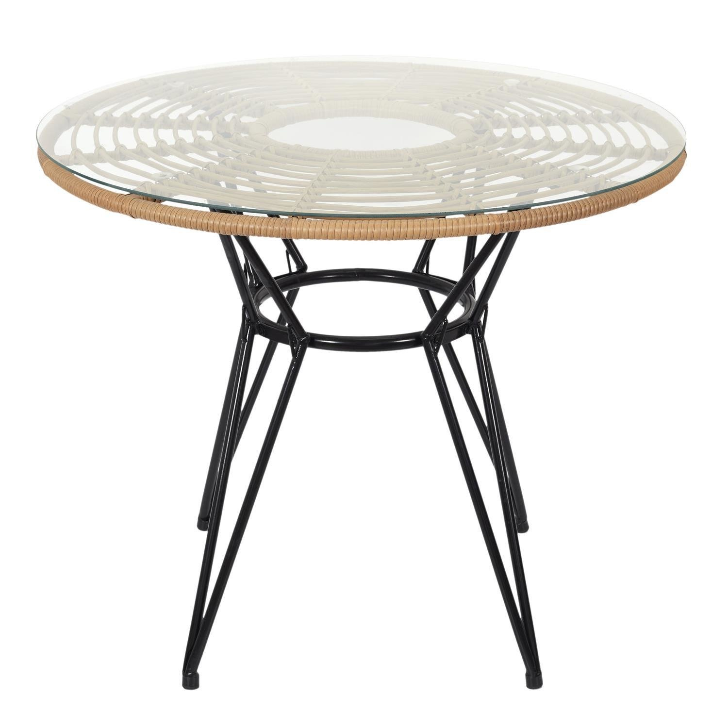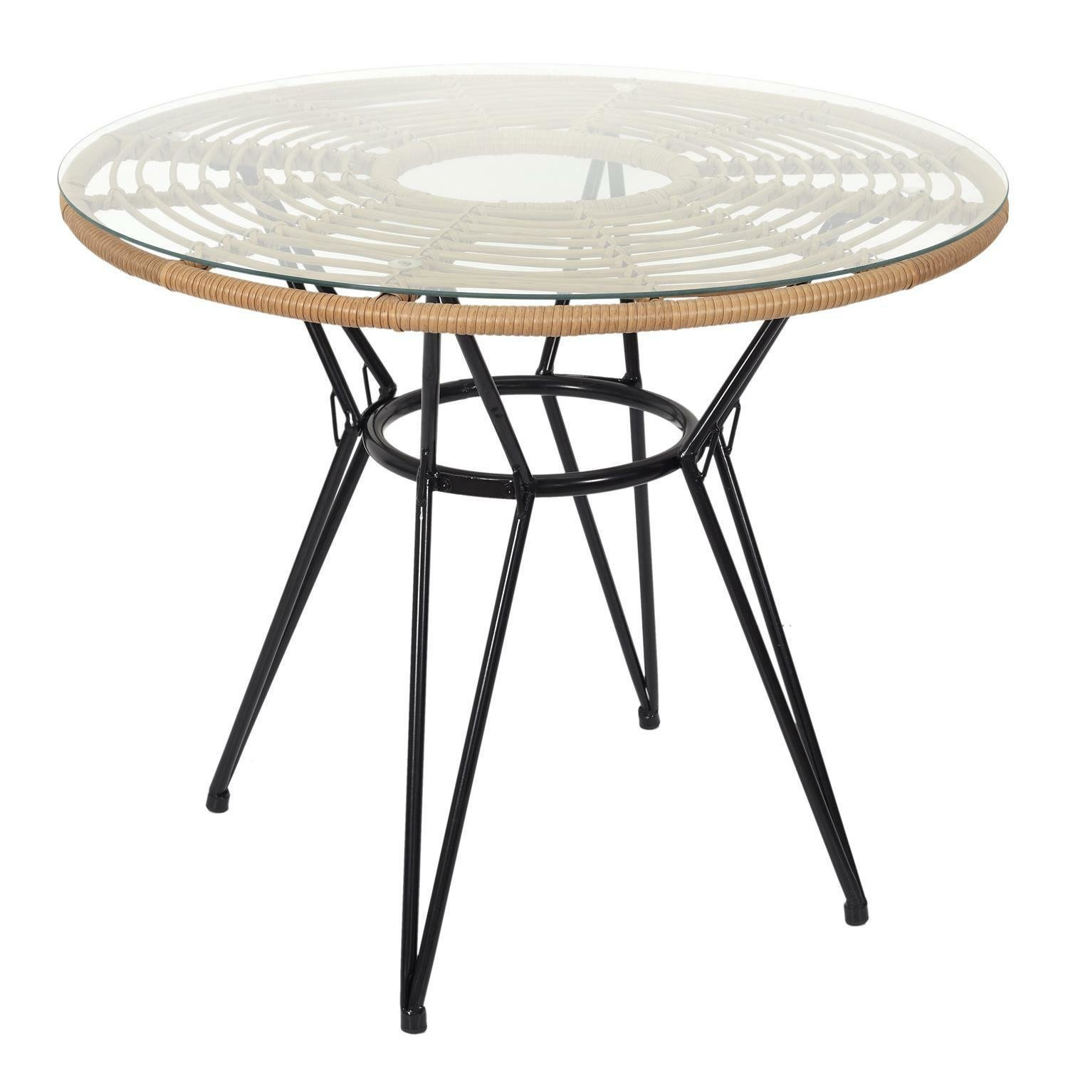 Okrągły stół Surabaya to mebel o ciekawym kształcie oraz wzornictwie. Podstawą stołu jest metalowa baza, składająca się z czterech nóg. Nogi stołu o ciekawie wygiętej konstrukcji, zostały wzmocnione okrągłą przepaską w 1/4 wysokości. Dzięki temu stół jest stabilny. Szklany blat stołu opiera się na podstawie ze sztucznego rattanu wzmocnionego metalowym szkieletem. Stół Surabaya idealnie pasuje do krzeseł o tej samej nazwie.