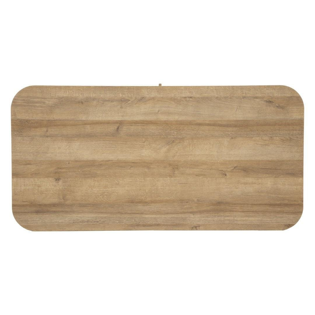Stolik kawowy Colva to spory stolik z dodatkową półką pod blatem, która kryje się za przesuwnymi frontami ozdobionymi pionowymi listwami. Jedynym elementem zdradzającym, iż za frontem kryje sie dodatkowe miejsce do przechowywania to drewniane uchwyty. Korpus oraz blat stolika wykonane zostały z wytrzymałej płyty MDF oklejonej okleiną imitującą drewno. Nogi stolika to metalowa podstawa, malowana proszkowo na czarno. Stolik do samodzielnego montażu.
