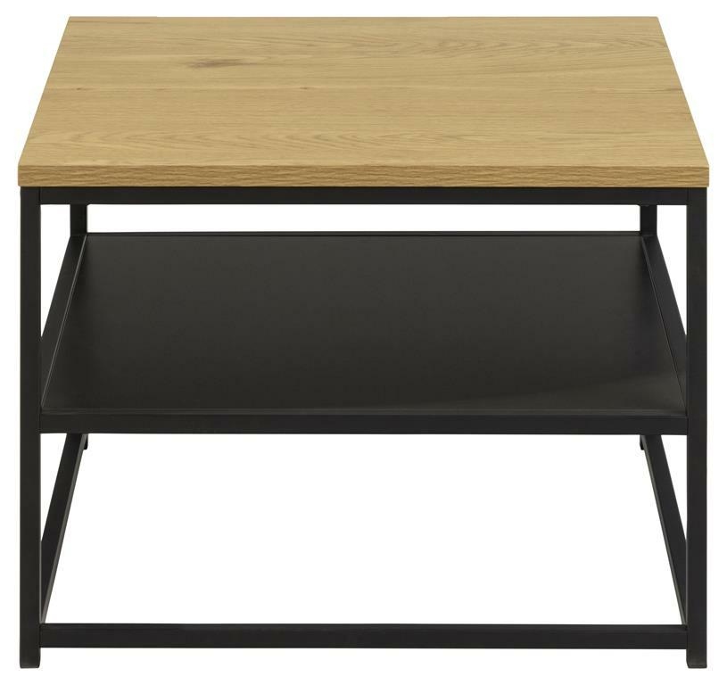 Stolik kawowy Gila w nowoczesnym, industrialnym stylu. Idealny do salonu, sypialni czy holu. Posiada kwadratowy blat z płyty MDF w okleinie dębowej, pod którym znajduje się czarna półka. Całość opiera się na metalowej konstrukcji malowanej proszkowo na kolor czarny. Odpowienio zaprojektowana konstrukcja zapewnia wyjątkową stabilność. Ilośc kartonów: 1 Wymiary kartonów: 61x59x10,5cm Waga kartonów: 10,9kg