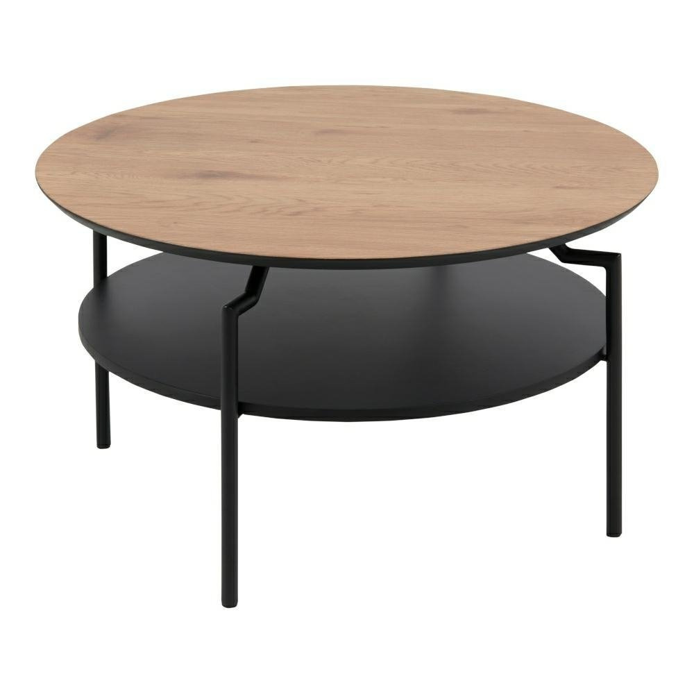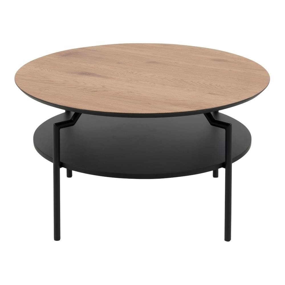 Stolik Goldington utrzymany został w stylu industrialnym. Blat stolika to płyta MDF, która została ozdobiona okleiną imitującą naturalny dąb. Ciekawe połączenie motywu drewna z czarną podstawą to hit tego roku. Podstawa stolika została zrobiona z metalu pomalowanego proszkowo na czarno. Na uwagę zasługuje ciekawy kształt podstawy stolika. Nogi zostały delikatnie wygięte tuż pod drewnianym blatem. Stolik posiada dodatkową czarną półkę.