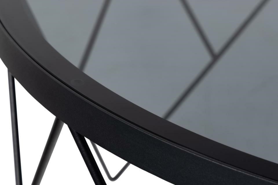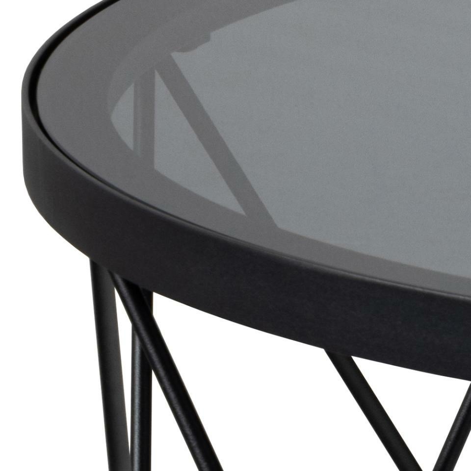 Okrągły stolik kawowy Halstow, blat wykonany z dymionego szkła hartowanego. Podstawa to matowa czarna stal malowana proszkowo. Harmonijne połączenie przydymionego szkła hartowanego i drucianej podstawy tworzy czarujący element centralny, w którym nowoczesne wyrafinowanie łączy się z artystycznym urokiem. Dzięki blatowi z przydymionego szkła jest lekki, a druciana podstawa nadaje mu uroku. Wymaga montażu. Wymiary kartonów: 84x84x7cm i 59x48x19cm.